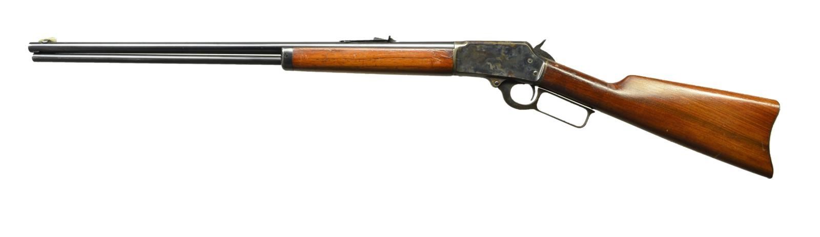 Cal. 25-20 M. S# D8757. Bbl. 24" round with brass blade in dovetailed base at front and standard V notched elevator adjustable rear. Mfg. 1894-1934; later production with "MODEL 94" on tang along with star proof. Caliber marking of "25-20 M" was referred to as 25-20 Marlin as they did not want to give any reference to Winchester even though the caliber was 25-20 Winchester. Straight gripped stock with blued carbine style metal buttplate and Marlin bullseye; only receiver and lower tang are case colored. CONDITION: good to very good appearance with its detriment being numerous light marks and chipped finish on stock set; appears extra finish but no compromising of dimensions. Great case colors on receiver. Occasional areas of light peppery oxidation throughout blued parts. Very good bright bore with hint of wear. PROVENANCE STATEMENT: Estate collection of Thomas F. Wolfinger. (22-6112/NW). CURIO. $750-1,000.