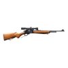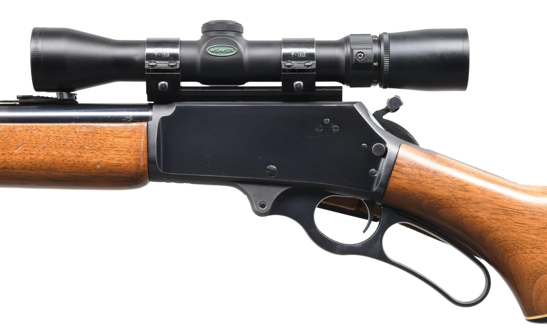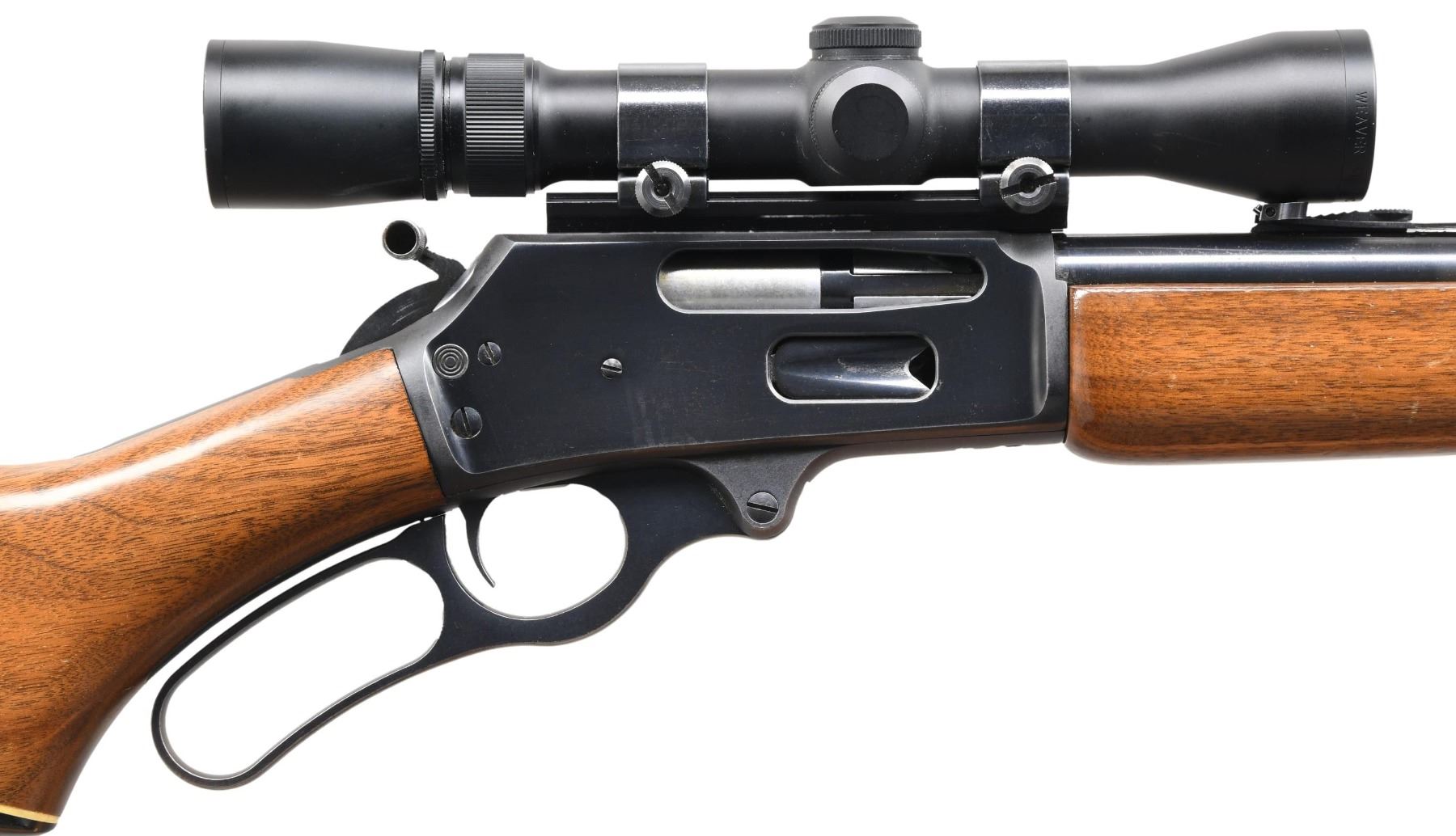 Cal. 356 Win. S# 15015143. Bbl. 20". Ramped bead front sight with hood. Sporting-style rear sight. Receiver-mounted Weaver 1.5-5x power scope. Scope has very good optics with a crosshair diamond reticle. Mfg. 1983-1986 with only 2441 made. Blued finish. Five-shot mag. Hammer with extension. Pistol grip walnut stock with factory recoil pad and plain forend. LOP: 13 5/8". Bottom-mounted sling swivels with Marlin sling. CONDITION: stock shows scattered handling marks and some light flaking varnish. Metal retains 97% original blue with a few handling marks and some light edge wear. Action functions properly when hand-cycled. Bright, near excellent bore. PROVENANCE: From the Collection of a Tennessee Gentleman. (24-4492/MJC). MODERN. $1,000-1,500.