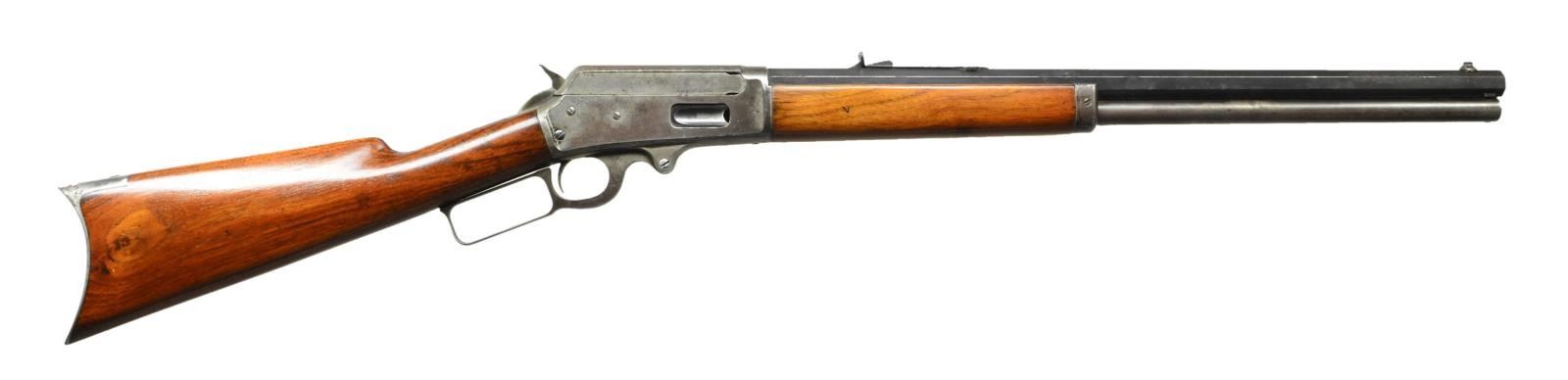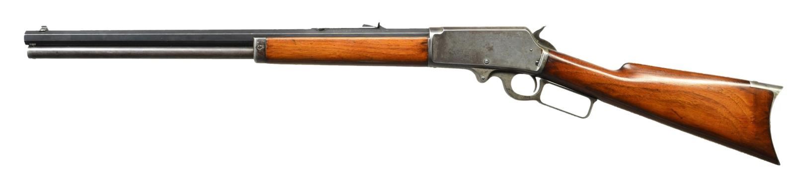 Cal. 45-90. S# 170706. Bbl. 22" octagon with dovetailed bead plus factory elevator adjustable rear. Mfg. 1898 (1895-1915) in largest caliber offered; barrel lengths of 24" and 26". Straight gripped stock set with capped rifle forend and crescent buttplate. Barrel marked "Special Smokeless Steel" plus "MARLIN SAFETY" on top of receiver. CONDITION: good to very good overall appearance having light marks and thinning finish. Magazine tube has grey patina tone. Faded case colors barely visible. It seems that the barrel may be shortened, but spacing of dovetails and all work of the nature seem correctly proportioned. Stock set is good or slightly better with extra finish added; no compromising to dimensions. Buttplate has some spots of active oxidation. Very good bright bore with only a hint of light wear. PROVENANCE STATEMENT: Estate collection of Thomas F. Wolfinger. (01-22171/NW). ANTIQUE. $750-1,000.