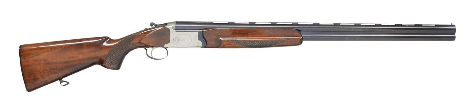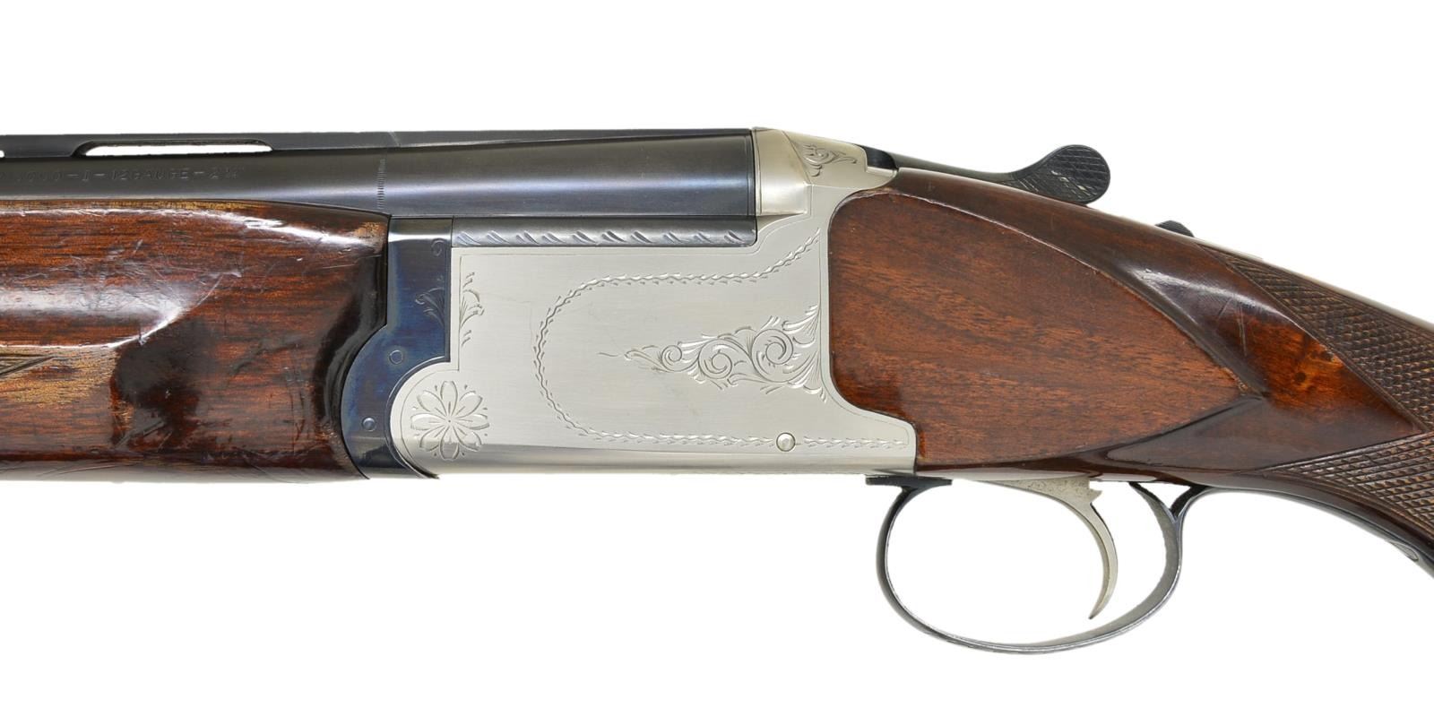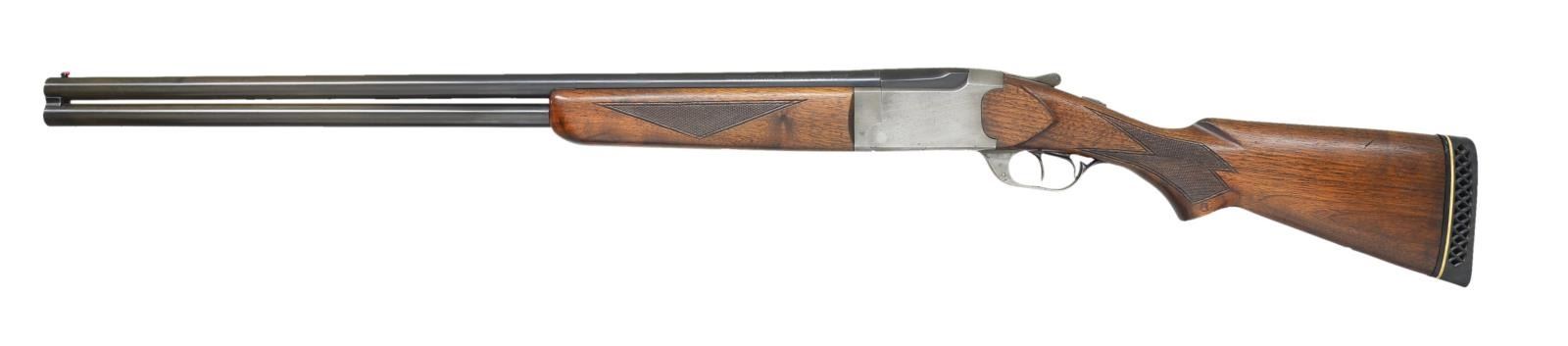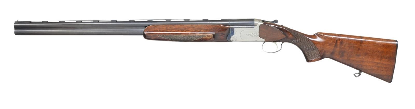 2) NIKKO MODEL 5000 GRADE I. S# K619749. Bbls. 28" VR w/ brass bead. Satin nickel finished boxlock action w/ light coverage of tasteful scroll ornamentation. SST. Selective ejectors. Walnut forearm & pistol grip stock w/ hand checkering. LOP: 14" over original buttplate. Stock has added swivel. CONDITION: 80% lightly faded blue showing handling marks. Receiver shows spots of tarnish. Wood has worn finish w/ numerous scratches, dents & marks. Good bright bores. (21-1849/DS). MODERN. $600-900.