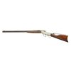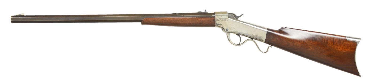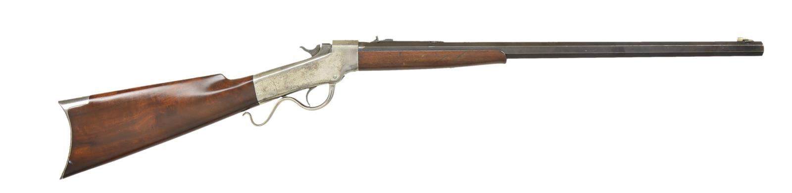 Cal. 22 Long RF. S# 21903. Bbl. is matching numbered heavy 24" (offered in 26", 28" and 30" as well) octagon (matching forend too) with brass blade sight in dovetailed base plus circular disk attached to standard elevator adjustable rear sight to create peep sight. Mfg. 1889 (1876-1891); similar to No. 2 Sporting Rifle but in small calibers (22 Short RF or Long RF). Marlin Fire Arms Co. marked nickel plated receiver, lever and buttplate; case colored breechblock. Simple forend with slight flare at tip. Nicely figured buttstock. CONDITION: good to very good overall appearance having beginning patina tone to barrel and peppery fading to plating showing mainly on right side of receiver and on buttplate. Numerous light marks on metal and wood finish that appears original. Very faint hairline cracks in buttstock at 10 to 12 o'clock position at frame juncture. Good case colors on breech block and hammer. Factory drilled and tapped tang sight holes have plug screws and slight witness marks of prior installation. Good bore with wear and even faint cleaned pitting. PROVENANCE STATEMENT: Estate collection of Thomas F. Wolfinger. (01-22167/NW). ANTIQUE. $900-1,400.