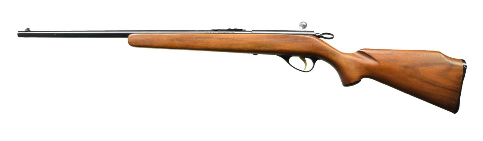 Cal. 22 S, L, LR. NSN. Bbl. 22" w/ Micro Groove rifling. Sporting rear sight. Gold bead front sight. Grooved receiver. Blued finish. Chrome bolt body & gold finish trigger. Walnut stock set w/ factory buttplate. LOP: 13 1/2". CONDITION: stock set shows a few light dings, light scratches & handling marks. Metal retains 95% original blue w/ some light oxidation on exposed edges. Very good bore. PROVENANCE: Estate collection of Thomas F. Wolfinger. (22-6130/MJC). CURIO. $200-400.