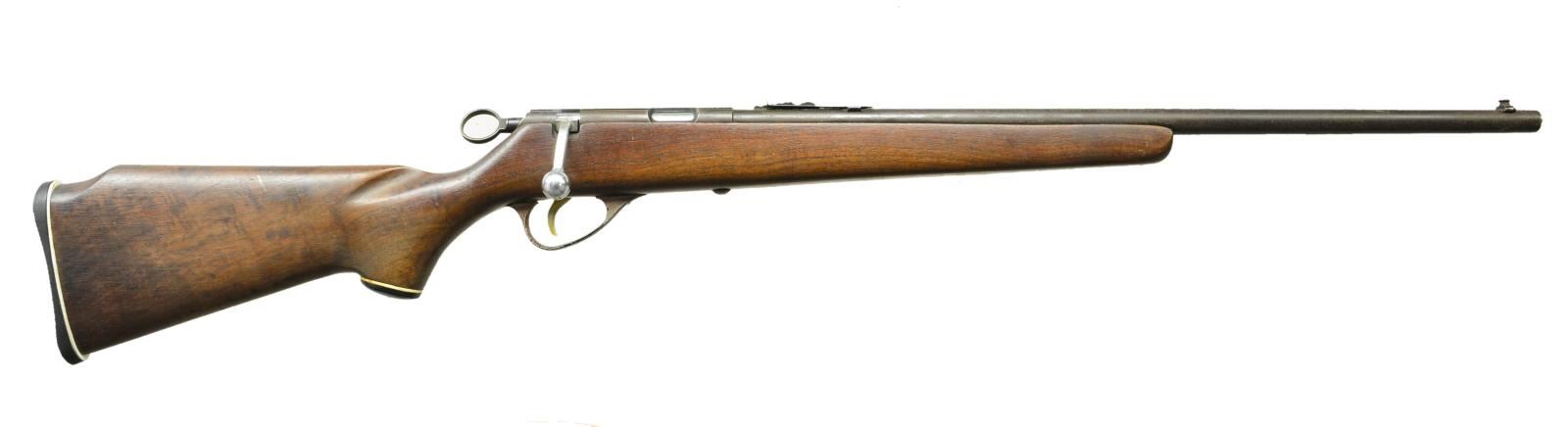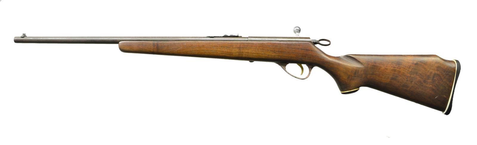 Cal. 22 S, L & LR. NSN. Bbl. 22" w/ Micro Groove rifling. Adj. sporting rear sight. Bead front sight. Pistol grip stock w/ poorly fitted factory buttplate. CONDITION: stock shows some staining, dings & handling marks. Trigger assembly is a gold colored patina w/ some oxidation staining. Blued surfaces are a dull brown oxidized patina. Very good bore. PROVENANCE: Estate collection of Thomas F. Wolfinger. (22-6125/MJC). CURIO. $50-100