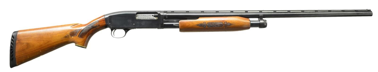 Cal. 12 Ga., 3". S# A46148. Bbl. 30" w/ VR & brass beads. Full choke. Bottom eject action. Walnut stock set w/ pressed checkering & Marlin grip cap. LOP: 14" to added black ventilated pad. CONDITION: Very good blue w/ peppery oxidation throughout. Good forearm. Stock has 2 large drilled holes on bottom behind receiver. Wrist has repaired break. Numerous gouges on bottom stock. Good shiny bore. PROVENANCE STATEMENT: Estate collection of Thomas F. Wolfinger. (22-6122/MD). MODERN. $200-300.