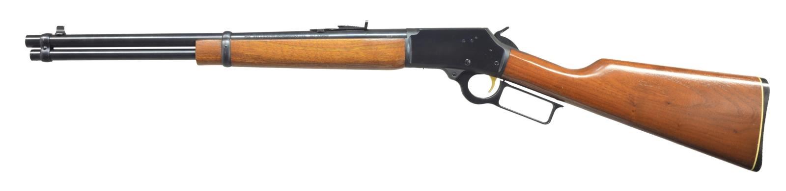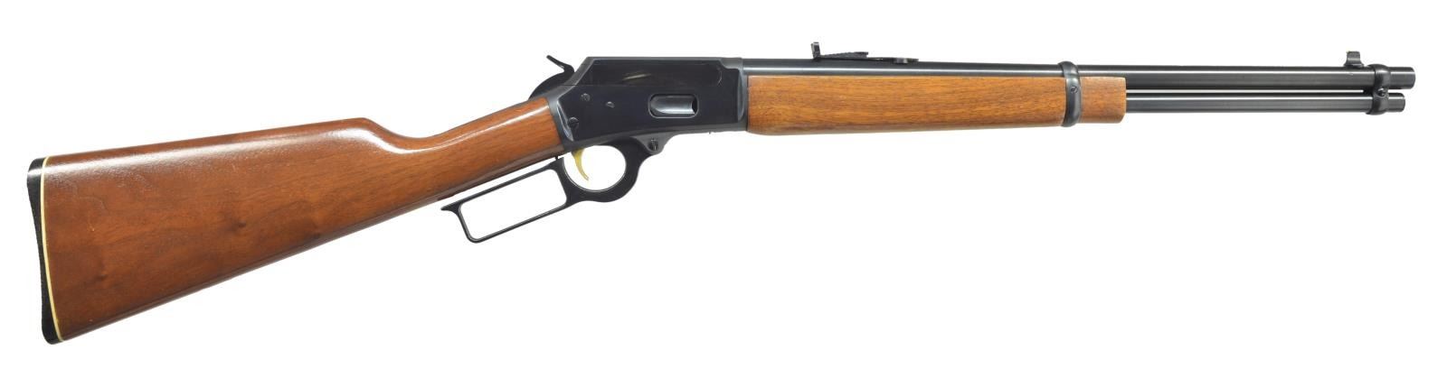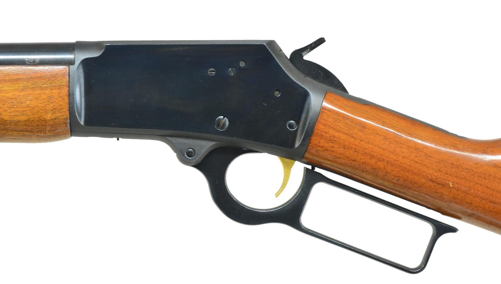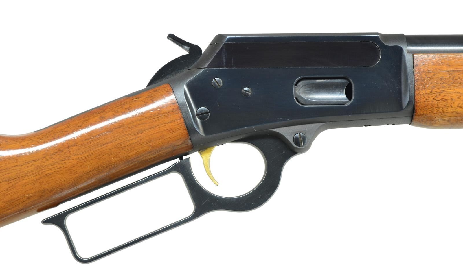 Cal. 357 Mag. S# 20130308. Bbl. 18 1/2" rnd. w/ Micro-groove rifling & North Haven, Conn. address. Bead front sight w/ elevator adj. rear sight. Full length mag. Blued action w/ gold finished trigger. Pre 1985 mfg. w/out hammer block safety. Band fastened carbine forearm & straight grip walnut stock w/ plastic buttplate, white line spacer & trademark in toeline. CONDITION: over 98% blue showing a few light scratches. Original wood finish show scattered sm. scratches & marks. Bright near excellent bore. (21-3349/DS). MODERN. $700-1,100.