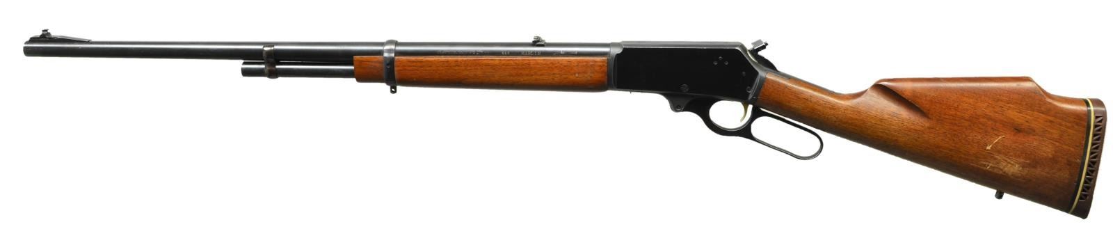 Cal. (Hand Stamped) 444 Marlin. S# Y20409. Bbl. 24”. Frame is from a Model 1895 & Bbl. has been added; w/ “444 MARLIN” hand stamped. We suspect this is a 44 Magnum barrel but can’t verify. Fixed ramp front & folding leaf rear sights. Magazine tube, gold plated trigger & smooth forend & straight grip Monte Carlo stock w/ high early comb. Marlin factory recoil pad, sling swivel studs & hammer extension. CONDITION: Bbl. metal has been refinished. Frame retains 90% plus glossy & matte blue finish. Stock set has light scattered scratches. Bore is very good, bright and strongly rifled. PROVENANCE STATEMENT: Estate collection of Thomas F. Wolfinger. (22-6149/CW). MODERN. $300-500.