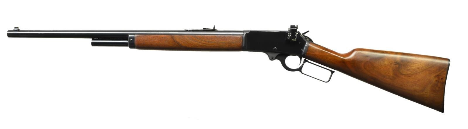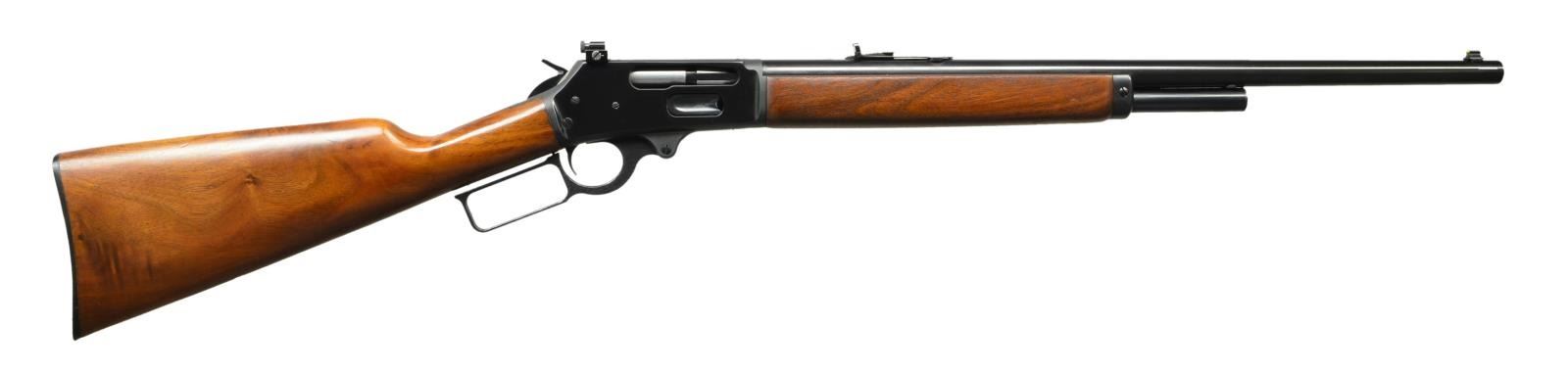 Cal. 45-70. S# B003678. Bbl. 22”. Early 1972 Mfg. rifle w/ 8 groove rifling. Fixed front & folding elevation adjustable rear sights. Williams receiver sight added left side frame. 4 shot magazine tube, smooth forend & straight grip stock w/ curved Marlin buttplate. No provisions for sling swivels. CONDITION: Metal retains about 95% original blue w/ some fine to light scattered usage marks. Stock set appears to have a light added coat of finish but shows light use only. Bore is near excellent, bright and strongly rifled. (22-6300/CW). CURIO. $800-1,200.