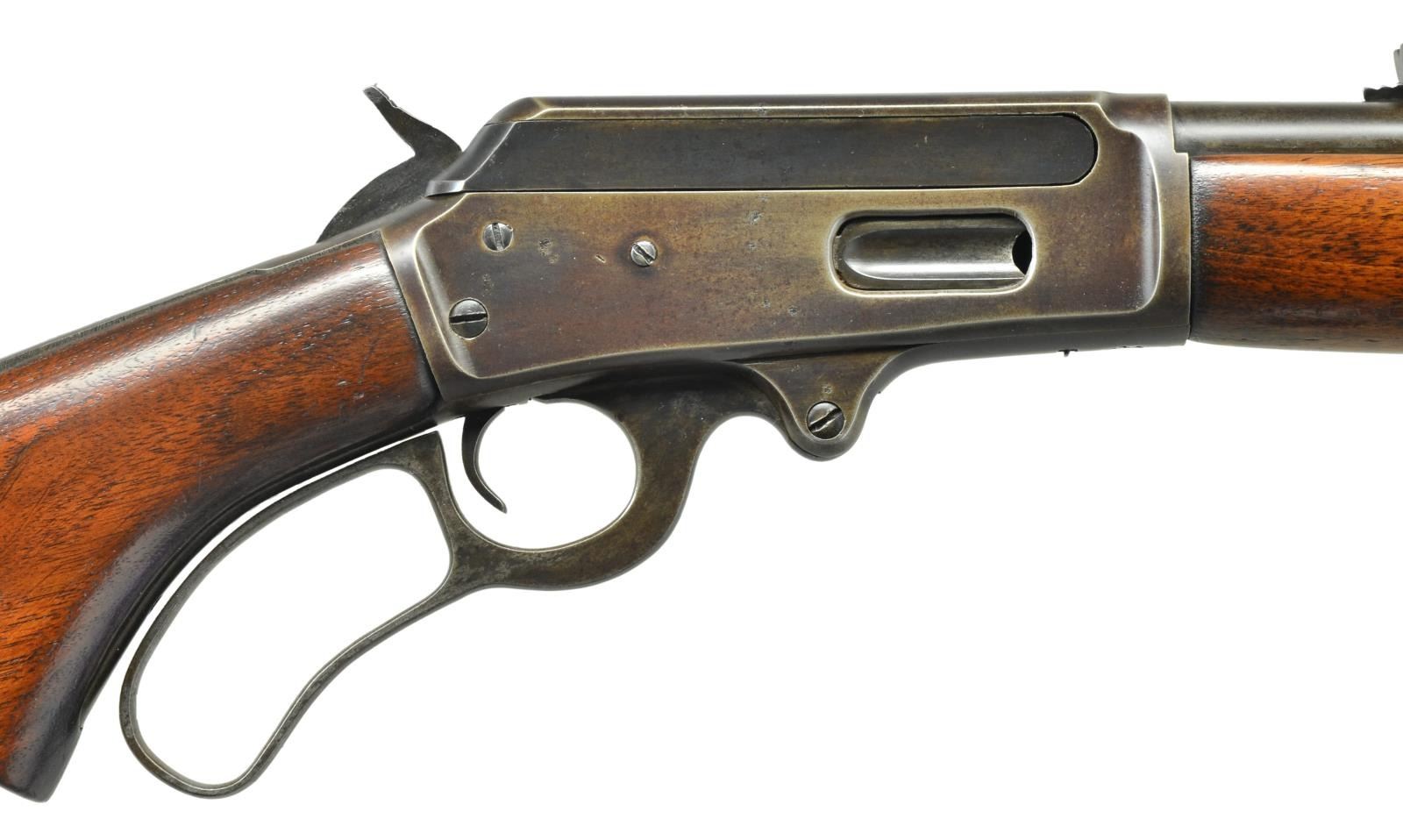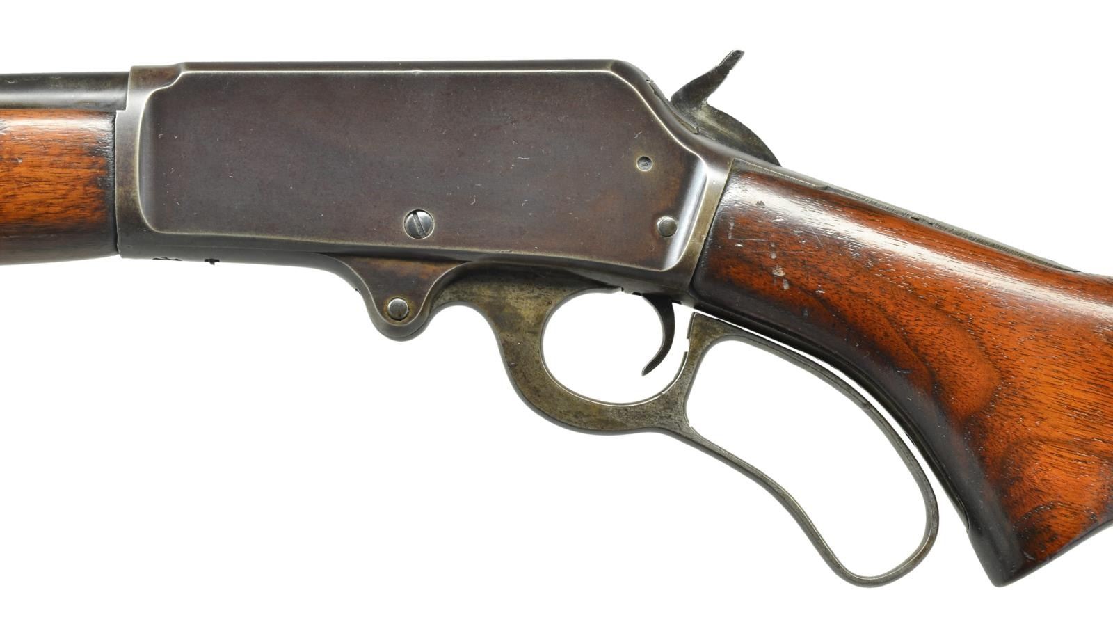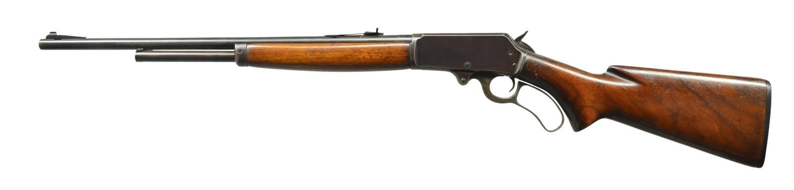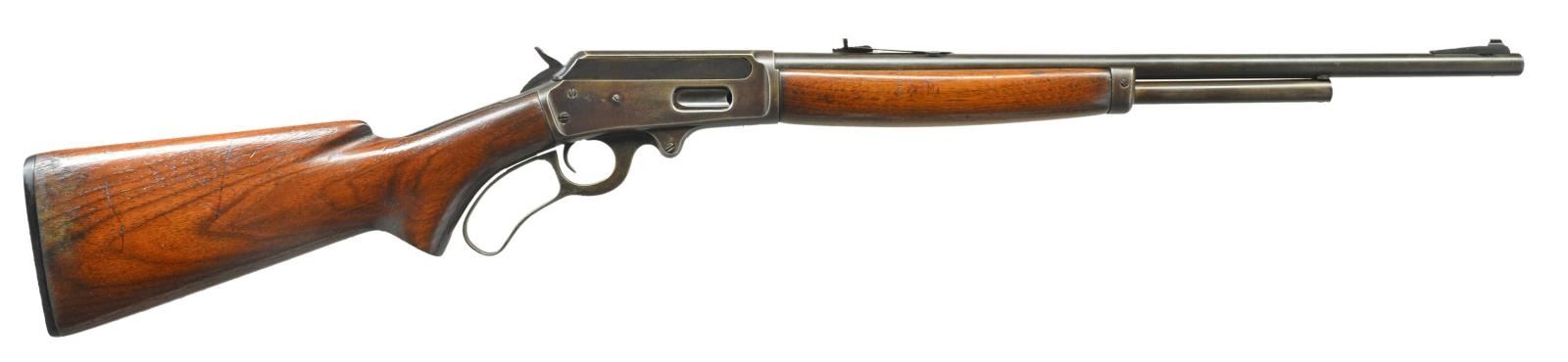 Cal. 32 Spl. S# 9971. The Model 1936 was a bridge between the 1893 & the later Model 36 & 336 rifles. Mfg. in 1936 only. Bbl. 20" carbine style. Replacement ramp mounted bead sight w/ replacement V notch rear sight. 2/3 Length mag. Top tang has plug screws in holes for sight attachment. Trim beavertail forearm & pistol grip walnut stock w/ replacement Marlin marked buttplate. UNATTACHED ACCESSORIES: combination tang sight w/ attachment screws. CONDITION: metal finish has a faded brown color w/ touch up finish & spots of light pitting. Heavily sanded & refinished wood is undersized at action shows scratches & marks. Bore is bright w/ sound Ballard cut rifling. (21-3701/DS). CURIO. $500-800.
