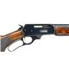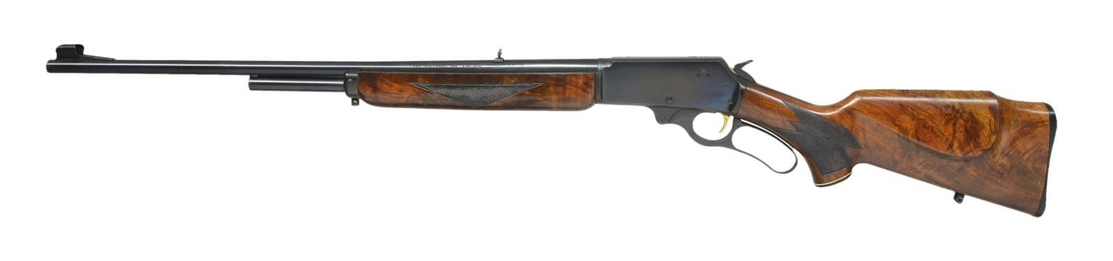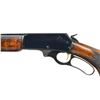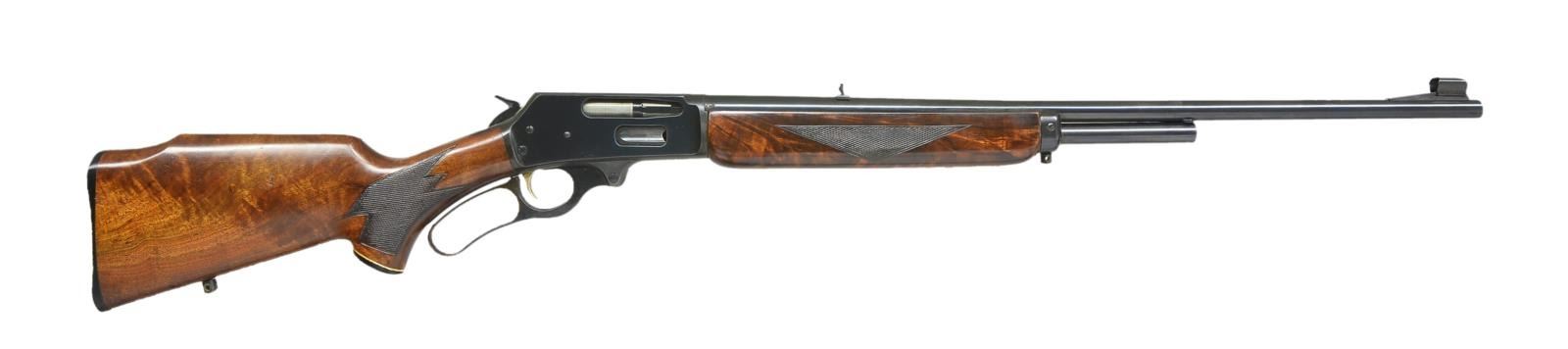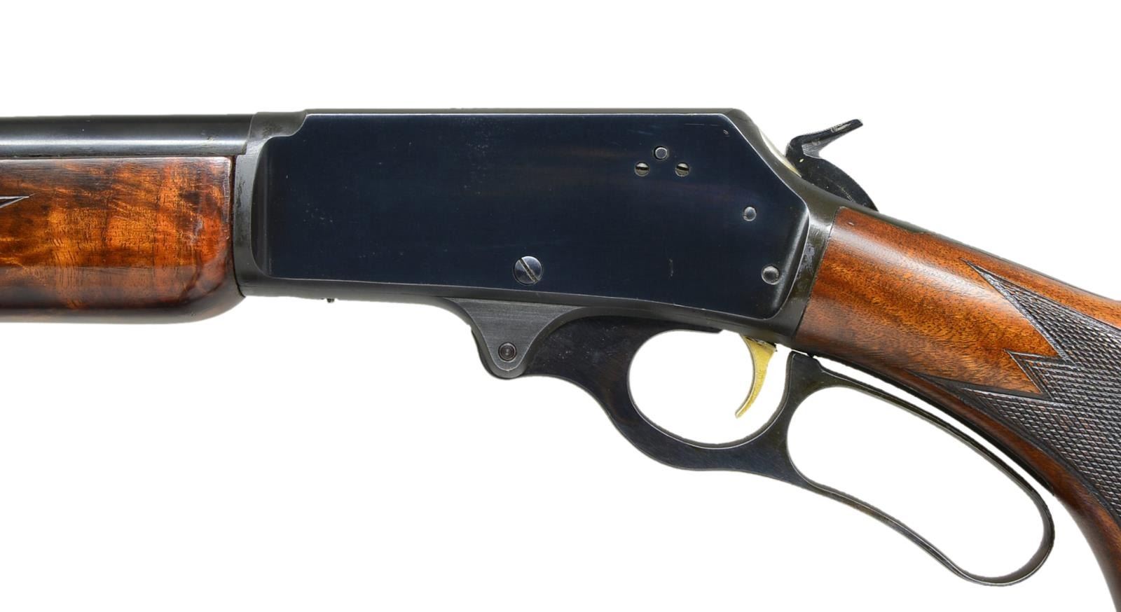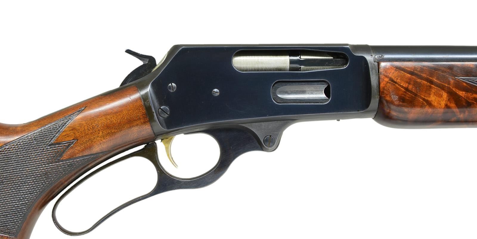 Cal. 30-30. S# T6777. Bbl. 24" rnd. w/ Micro-groove rifling. Ramp mounted hooded bead front sight & folding leaf rear sight. 2/3 Length mag. Gold finished trigger. Forearm & pistol grip Monte Carlo cheekpiece stock w/ hard rubber grip cap & white line spacer. Fancy walnut stock set has deluxe point pattern checkering w/ trademark in toeline having QD swivel bases & Marlin buttplate. Deluxe style rifle only mfg. 1940-1962, this rifle is 1960 mfg. CONDITION: 97% blue showing slight edge wear & sm. marks. Wood shows scattered scratches & marks. Near excellent bore. (21-1843/DS). CURIO. $700-1,000.
