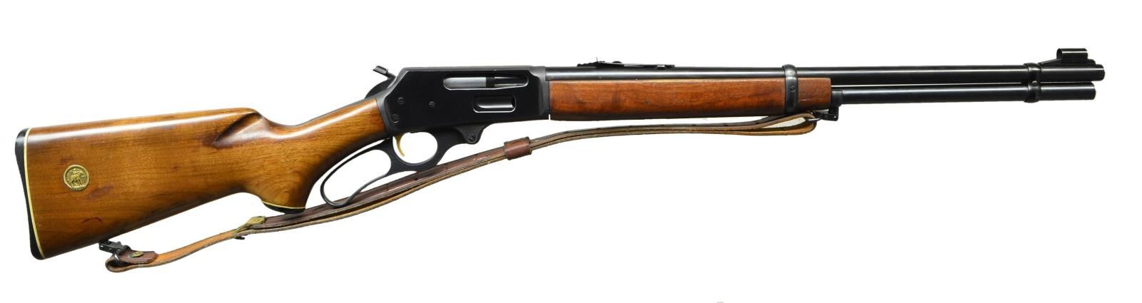 Cal. 30-30. S# 70 95152. Bbl. 20". Fixed ramp front w/ hood & elevation adjustable rear sights. Full length magazine tube, bbl. bands, gold plated trigger & hammer extension. Smooth forend & ebony capped semi pistol grip buttstock w/ sling swivels & Hunter leather sling. Right side butt has inlayed 1870/1970 Marlin centennial brass disk. CONDITION: very fine. Metal retains about 95% original finish. Stock set has a few scattered light marks. Grip cap is flaking & chipping. Bore is very good, strongly rifled. (22-6296/CW). CURIO. $450-750.