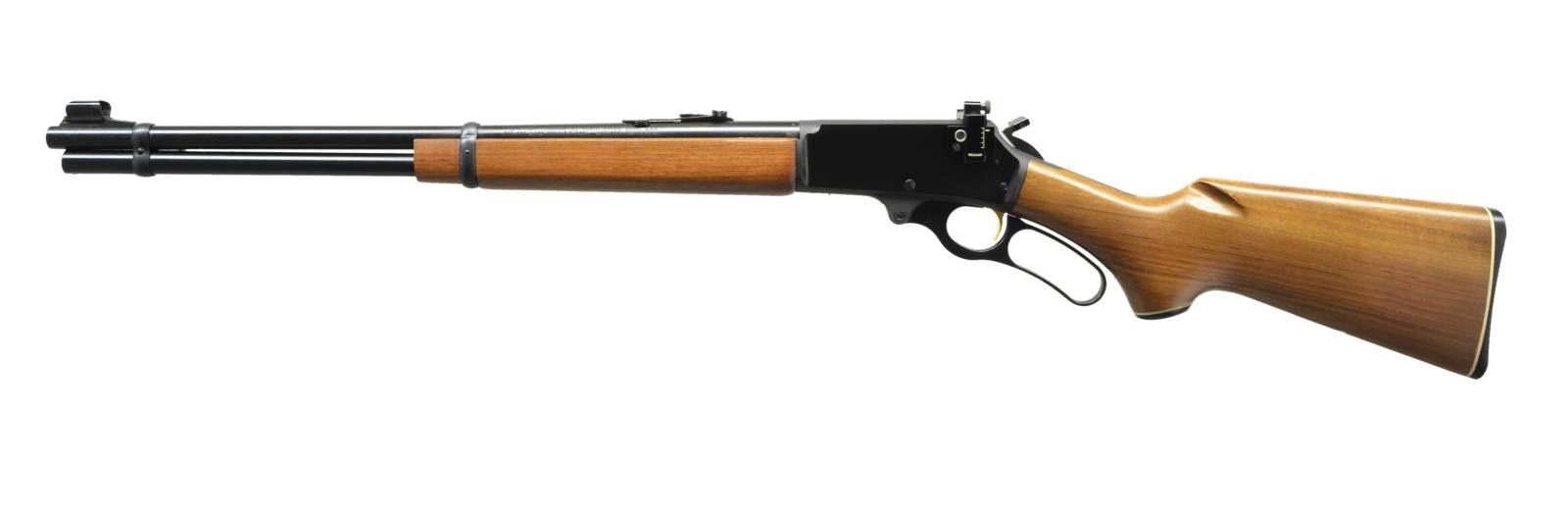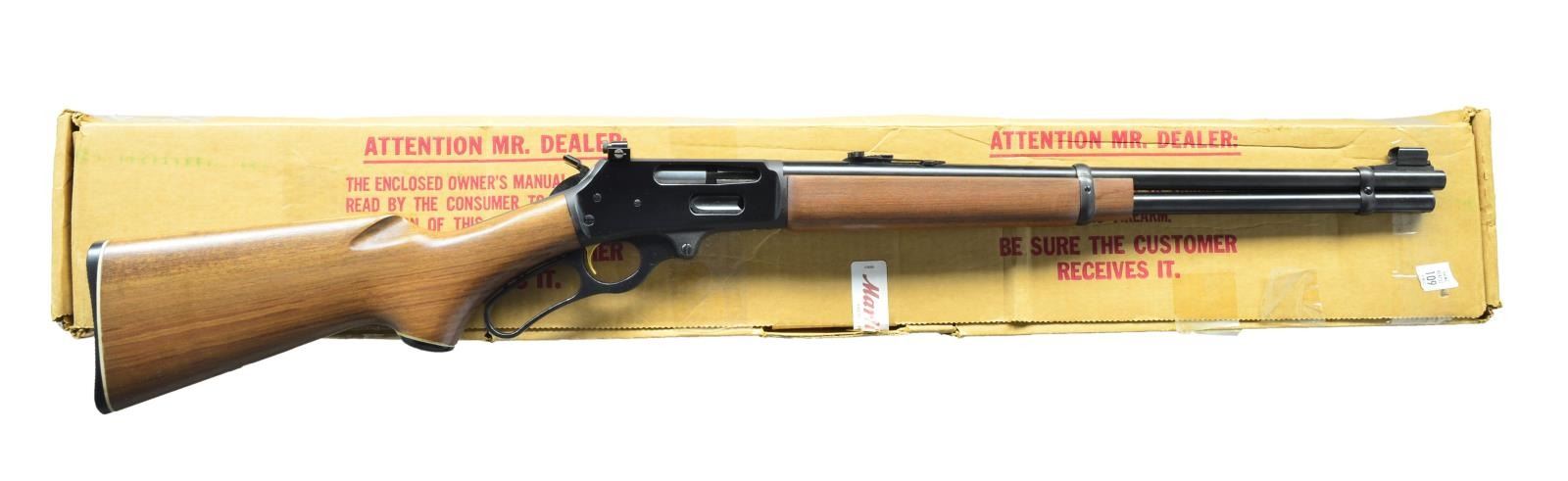 Cal. 35 Rem. S# 21120265. Bbl. 20" w/ Micro-groove rifling & North Haven, CT address. Hooded ramp bead front sight w/ elevator adj. folding leaf rear sight & Williams receiver sight. Full length 6 shot mag. Blue finished rifle that predates the crossbolt safety. Features include gold finished trigger & hammer extension. Band fastened walnut carbine forearm & capped pistol grip stock w/ original buttplate & white line spacers. UNATTACHED ACCESSORIES: original box containing owner's manual & hunter's pocket guide. Box is tattered extra tape. CONDITION: near new retaining over 99% wood & metal finish. Near excellent bore. (21-3107/DS). CURIO. $600-900.