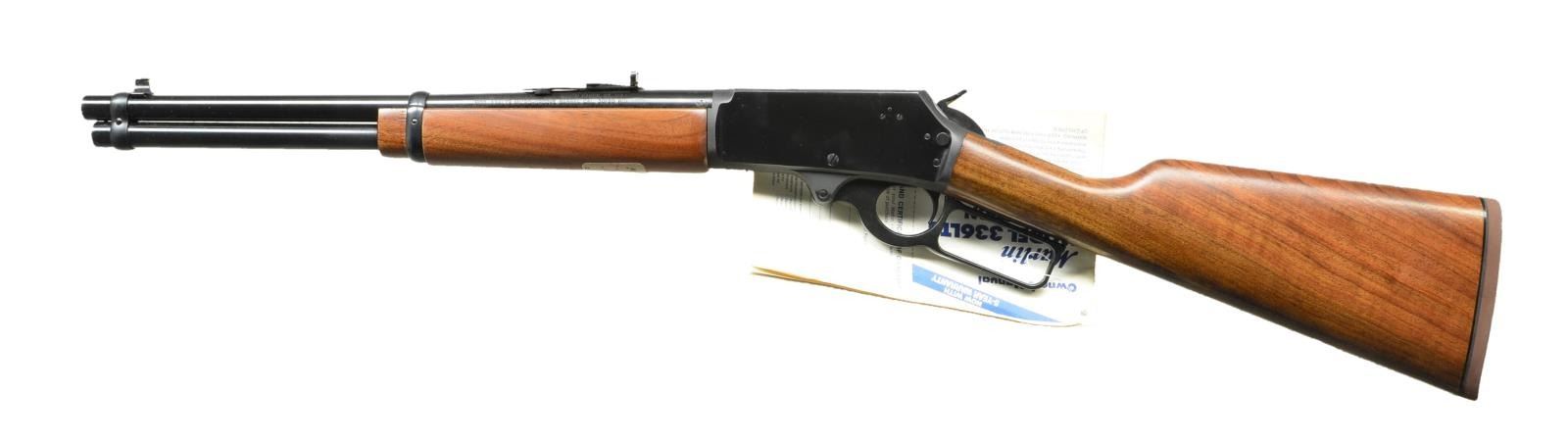Cal. 30-30. S# LTS02551. Bbl. 16". Manufactured 1988-1989. Blued finish on exposed metal surfaces. Blade front & elevation adjustable buckhorn rear sights. Serial number on top rear tang. Hardwood stock & forend. Cross slide receiver safety below hammer. UNATTACHED ACCESSORIES: factory cardboard box, hammer spur extension. CONDITION: all aspects indicate very little use, if any. Forend still retains factory sticker & owners manual connected to lever. Finish coverage is complete & consistent w/ no noticeable wear. Wood forend still retains factory sticker. No obvious blemishing on furniture. Bore is bright w/ strong rifling. PROVENANCE: Estate collection of Thomas F. Wolfinger. (22-6102/JZ). MODERN. $400-600.