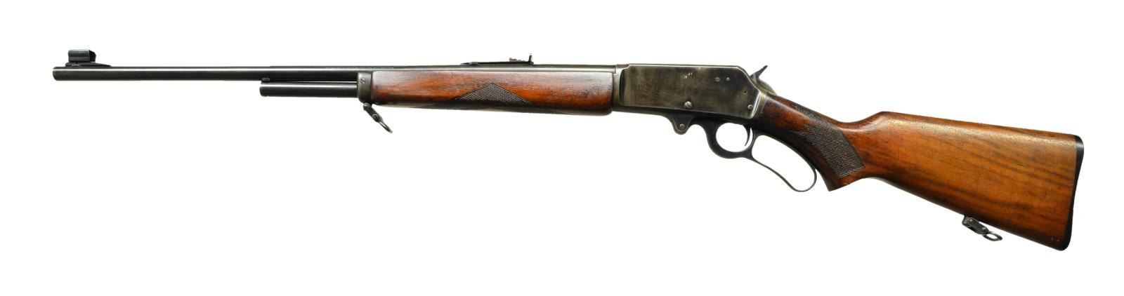 Cal. 30-30. S# G9067. Bbl. 24". S# places production in 1950; too late for the frame to be for the scarce 36 A-DL; yet rifle has proper 36 A-DL bbl. Fixed front & adjustable rear sights. Roll mark on bbl. is “36 A-DL” & the forend & pistol grip stock both feature hand checkering, sling swivel studs fitted w/ Winchester sling swivels. Unmarked, serrated black buttplate. Top of frame marked “MARLIN SAFETY” & upper tang is NOT marked “1936”. CONDITION: metal is blued w/ 90% coverage on bbl. & 60% on the frame w/ scattered fine pitting. Stock set has an added coat of varnish over scattered fine to light marks & scratches. Bore is good plus, strongly rifled w/ fine spots of pitting. (22-6298/CW). CURIO. $500-700.