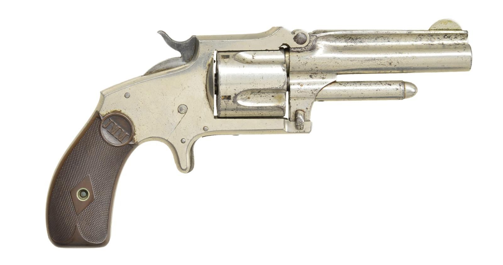 Cal. 38 S&W. S# 6247.Bbl. 3 1/4" ribbed with blade sight; model marks on top and patent marks on left side. Mfg. 1876-1887 (approx. 12,000 units) with "JMM" marked checkered hard rubber grips as used on early models; later models had "M.F.A.". Nickel plated with spur trigger, oval side plate and tip up barrel. Matching numbers on barrel and 5 rd. cylinder. CONDITION: good appearance of original finish having flaking finish loss mostly on cylinder and barrel. Very good grips with slight hand wear. Proper mechanical functioning. Fair bore with distinct rifling and pitting. PROVENANCE STATEMENT: Estate collection of Thomas F. Wolfinger. (01-22203/NW). ANTIQUE. $300-400.