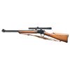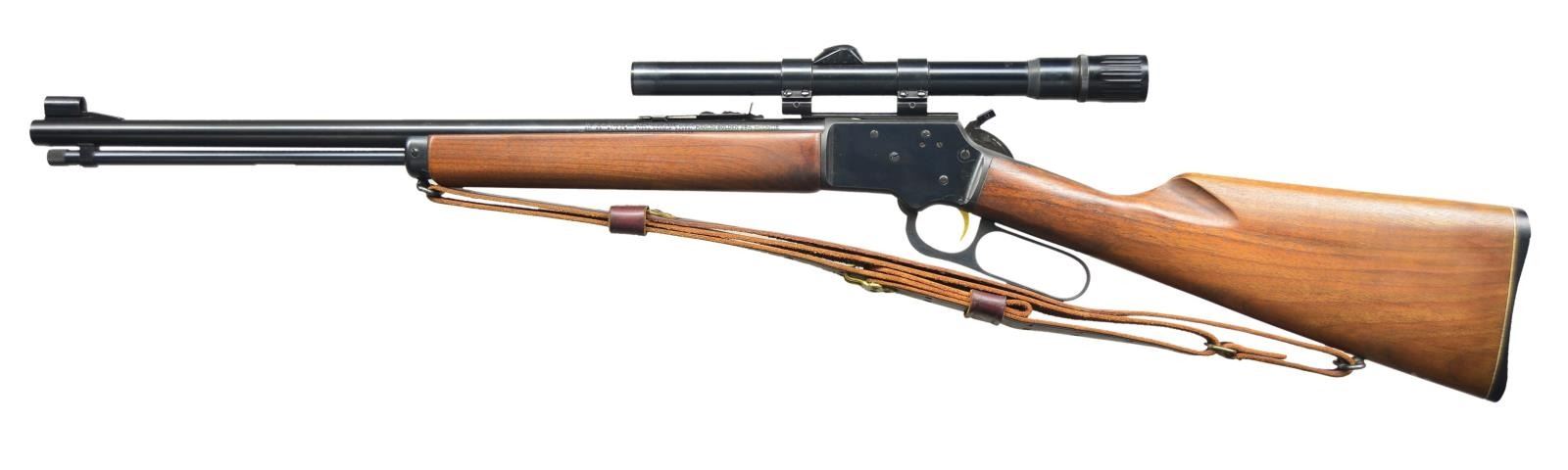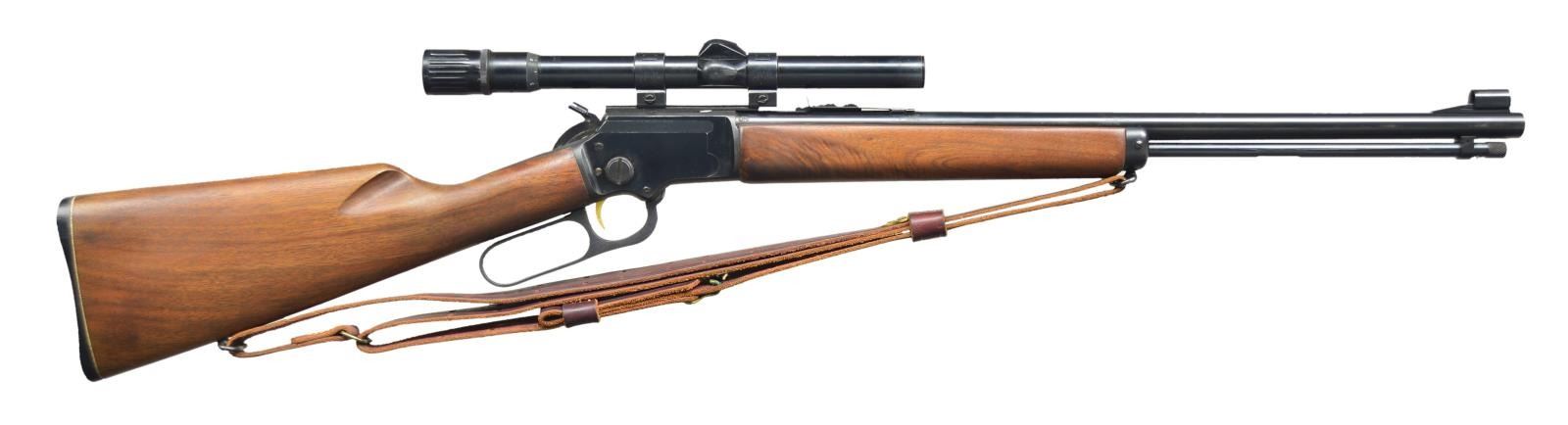 Cal. 22 S, L & LR. S# Z21355. Bbl. 20". Hooded fixed ramp front & elevation adjustable rear sights. Weaver V22 3-6X scope w/ standard crosshairs & clear optics. Blued finish, gold colored trigger, hammer extension w/ smooth forend & straight grip stock. Sling swivels hold a commercial leather sling. MAGS: internal tube holds 20 Short, 16 Long or 15 LR cartridges. CONDITION: metal retains about 95% original finish w/ light scattered marks & freckling. Stock set has a few light dings & scratches. Bore is very good, bright & strongly rifled. (22-5952/CW). CURIO. $700-1,000.