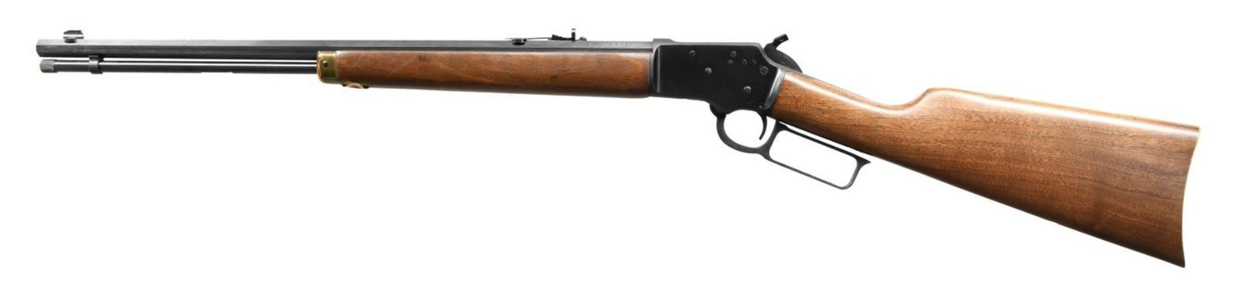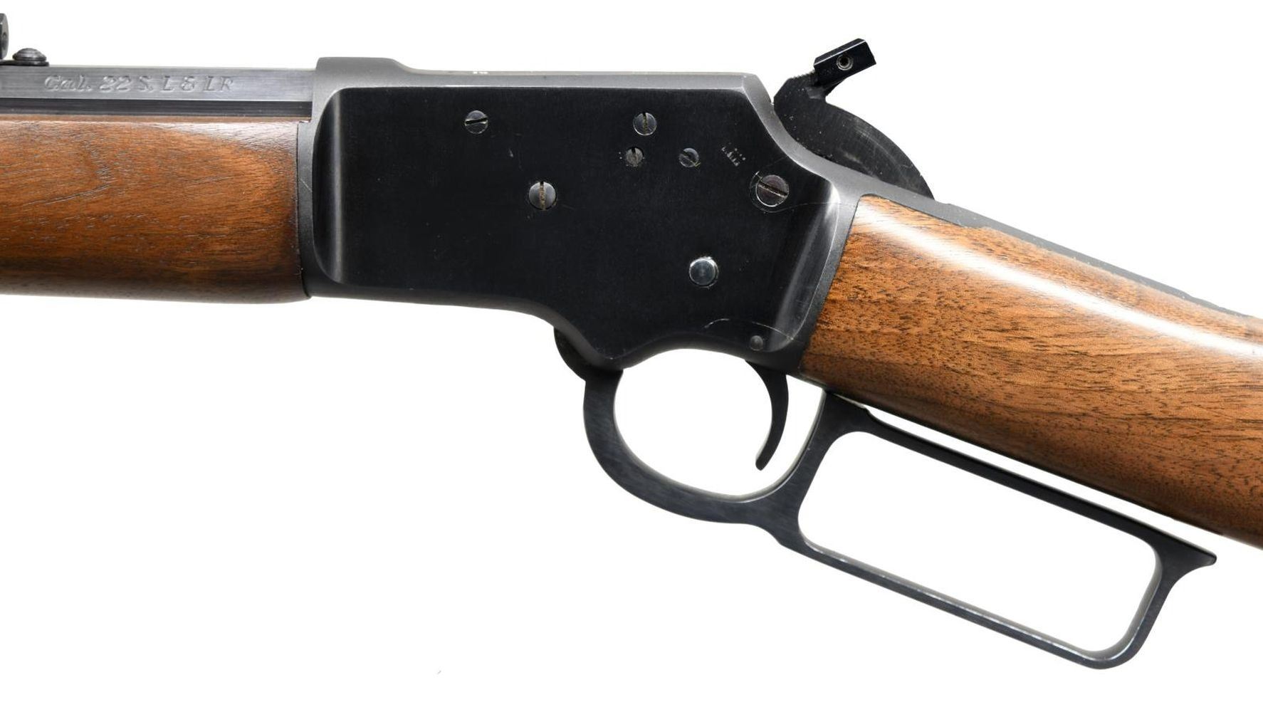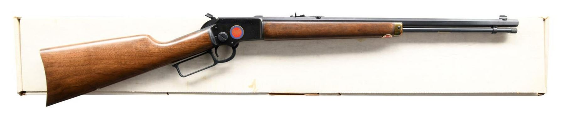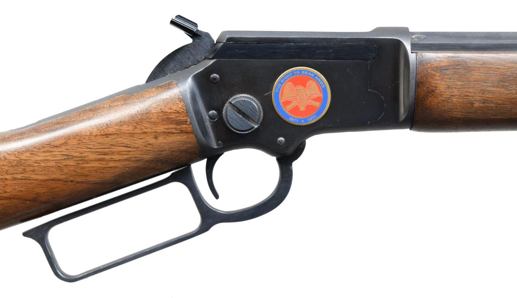 ACTION RIFLE WITH FACTORY BOX & SLEEVE. Cal. 22 S, L, LR. S# 7188665. Bbl 20". Model 39M Article II lever action rifle mfg. by Marlin commemorating the 100th anniversary of the National Rifle Association. The octagonal bbl. is marked with the model designation, followed by Marlin's mfg. information on the top flat, with the cal. designation on the left. Right side of receiver exhibits a medallion with "THE RIGHT TO BEAR ARMS" and "1871 * 1971" within the outer ring, and an eagle with crossing rifles in the center. Metal components exhibit a blued finish, with the buttplate and forend cap being comprised of brass. Smooth plain American walnut straight grip buttstock and forend. Brass beaded blade front sight with U-notch rear sight. UNATTACHED ACCESSORIES: original factory box (that appears to be matching with the last couple of digits no longer being present on the label), with commemorative sleeve. CONDITION: excellent, with metal components retaining the vast majority of their original factory blue finish, exhibiting a few scattered marks from handling and storage. Mirror bore, exhibiting well defined rifling throughout. Wood furniture is excellent overall. Box shows age related discoloration with some tearing and mild handling marks. Sleeve exhibits wear overall, with some tearing and creases at the corners. PROVENANCE: The Collection of Gun Sport Ltd owned by Jon R. Thomas. (23-3626/MLW). CURIO. 800-1,200.