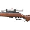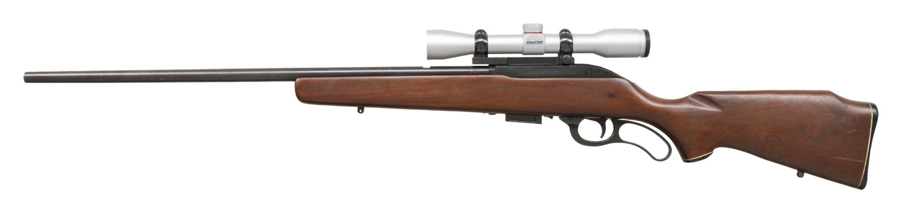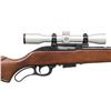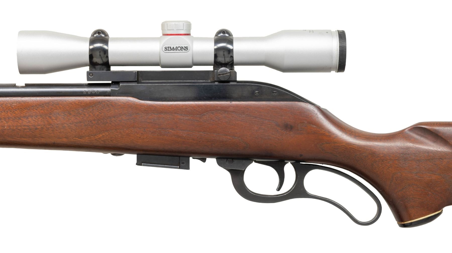 Cal. 256 Win Mag. S# 2590. Bbl. 24". Rifle lacks iron sights with front sight holes having screws. Receiver mounted Simmons 4x32 22 Mag Scope. Scope has duplex crosshair reticle & good optics. Blued finish. Hardwood stock with bottom mounted sling studs. MAGS: 1-4 rd. CONDITION: stock shows scattered handling marks. Metal retains 93% original blue with a few spots of oxidation, some edge wear & handling marks. Action functions properly when hand cycled. Near excellent bore with strong rifling. PROVENANCE: Estate of Groves Herrick. (25-5744/MJC). CURIO. $300-400.