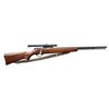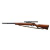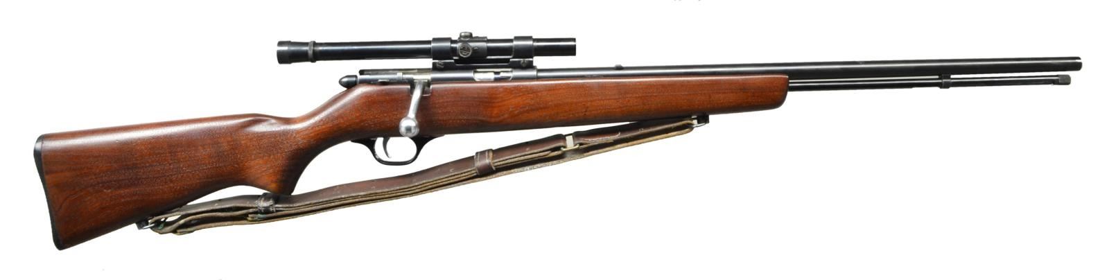 Cal. 22 S, L or LR. NSN. Bbl. 22”. No front sight; plug screws in holes, rear sight dovetail has sight blank. A Weaver B4 scope w/ crosshair reticle & very cloudy optics mounted on a Weaver Tip Off mount. Tube magazine, blued metal w/ in the white bolt body. Smooth one piece stock w/pistol grip & aluminum trigger guard. Sling swivels hold a commercial leather sling. CONDITION: Metal retains about 90% finish w/ light scratches & marks. Stock has an added coat of finish. Bore is good, strongly rifled & a bit dull. (22-6288/CW). CURIO. $150-250.