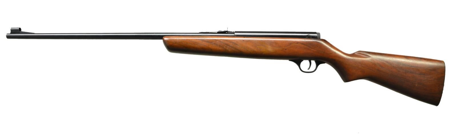 Cal. 22 LR. NSN. Bbl. 24". Elevator adj. rear sight. Ramped bead front sight w/ hood. Blued finish. Tubular mag in butt stock. Walnut pistol grip stock. CONDITION: right side of butt shows several drying cracks, stock otherwise shows some dings, scratches & handling marks. Metal retains 90% original blue w/ some high edge wear. Very good bore. PROVENANCE: Estate collection of Thomas F. Wolfinger. (22-6147/MJC). CURIO. $300-400.