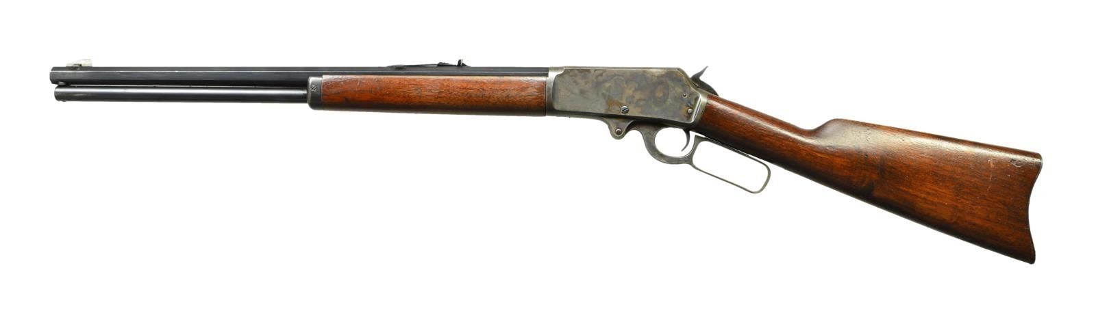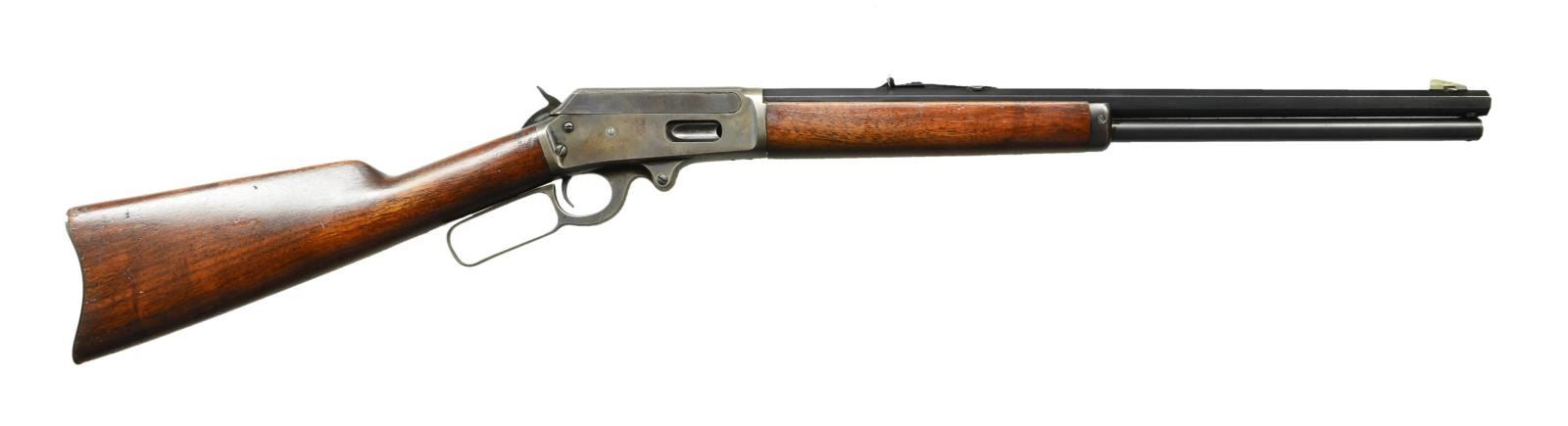 Cal. 30-30. S# a1745. Bbl. 20" tapered octagon with dovetailed base having brass blade plus standard V notched elevator adjustable rear. Mfg. 1893-1936 as predecessor to Model 36. "A" serial prefix would indicate just prior to WW-II as "B" represents 1941-1945 with most references starting with "E"; no found reference for "A". Barrel marked "Special Smokeless Steel" and does not appear result of shortening longer barrel. Flat top receiver marked "MARLIN SAFETY". Straight gripped buttstock having carbine style buttplate. Case colored receiver and lever with blued barrel. CONDITION: Good plus appearance having refinished barrel and stock set. Barrel professionally done with near excellent flats; thin "Smokeless" marking. Good to very good case colors mixed with light cleaned peppery oxidation. Grey toned buttplate. Mag. tube with thinning and faint peppery oxidation. Forend better appearing than buttstock but handling marks on both. Light screw slot damage to hammer pivot and tang screws. Near excellent bore. PROVENANCE STATEMENT: Estate collection of Thomas F. Wolfinger. (22-6141/NW). CURIO. $650-900.