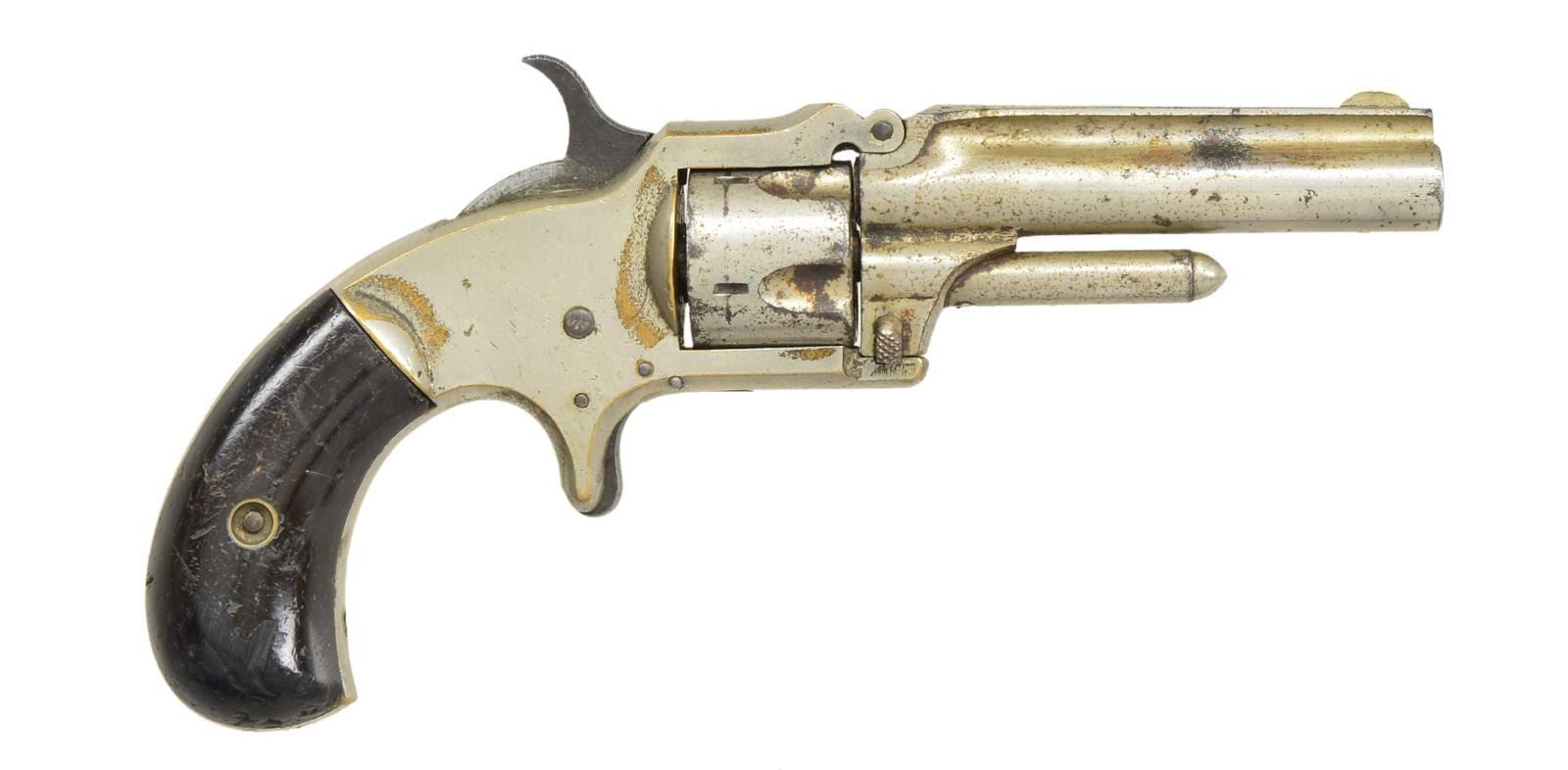 Cal. 30 RF. S# 7625. Bbl. 3" ribbed with model markings on top. Mfg. 1873-1876 with spur trigger and short 5 rd. fluted cylinder having stop notches at rear (10,000 units); total Model 1872 production was 26,000 units 1873-1887 with various cylinder lengths and configurations. XX model of 1873 was for 22 caliber; XXX model of 1872 was 30 caliber. Nickel plated with matching numbers on frame (under left grip), barrel, cylinder and rosewood grips. CONDITION: good general appearance as refinished. Proper mechanical functioning and very good grips having minor handling marks. Fair bore with intact rifling and cleaned pitting throughout. PPROVENANCE STATEMENT: Estate collection of Thomas F. Wolfinger. (01-22197/NW). ANTIQUE. $250-400.