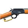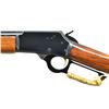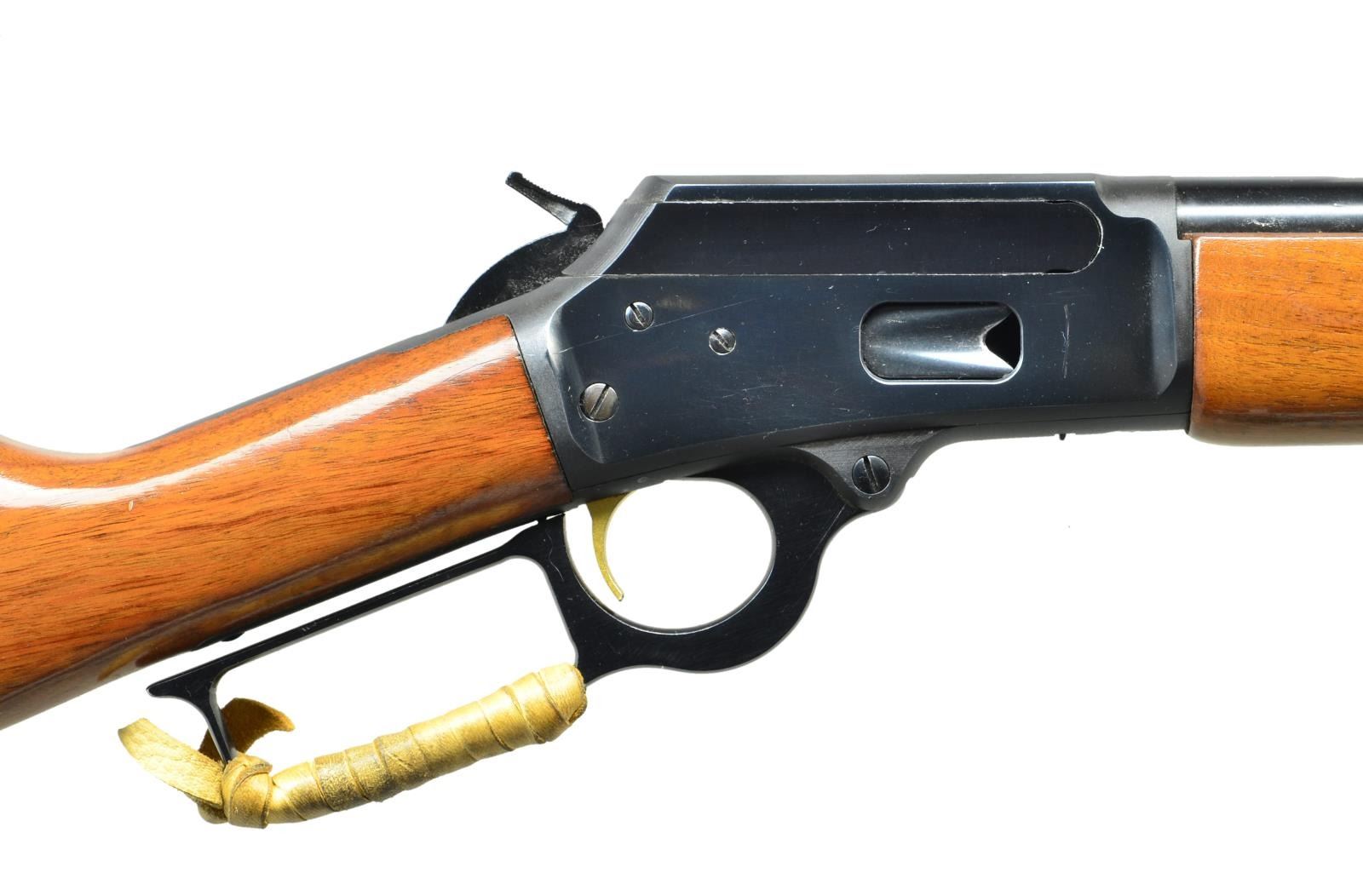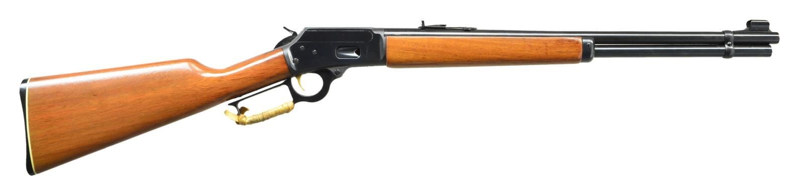 Cal. 44 Mag. S# 22158852. Bbl. 20" JM marked w/ hooded brass bead ramped front sight & elevator adjustable rear. Mfg. 1978 w/ straight gripped walnut stock set having capped forend plus white line plastic logo buttplate & Marlin Bullseye. Pre cross bolt safety model. Lower portion of lever wrapped in rawhide; gold trigger. CONDITION: faint scratch in front of loading gate plus some light stock marks, all other aspects near excellent including bore. (22-3600/NW). MODERN. $700-1,000.