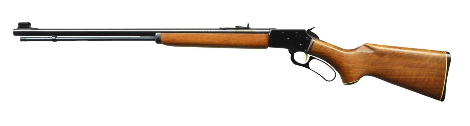 Cal. 22 S, L or LR. S# 16260560. Bbl. 24”. Takedown version w/ hooded fixed ramp front & elevation adjustable rear sights. Full length magazine tube, gold plated trigger, gold highlighted “ORIGINAL GOLDEN 39A” on breech end of “JM” marked Bbl. Smooth forend & ebony capped pistol grip stock w/ fluted comb, white spacer & factory Marlin buttplate. UNATTACHED ACCESSORIES: Factory box serial numbered to rifle & factory scope bases in envelope. CONDITION: Metal retains 95% blue & stock set has a few dings w/ fine water staining on the buttstock. Mircogroove rifled bore is very good, bright & strong. (22-6304/CW). MODERN. $600-800.