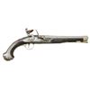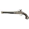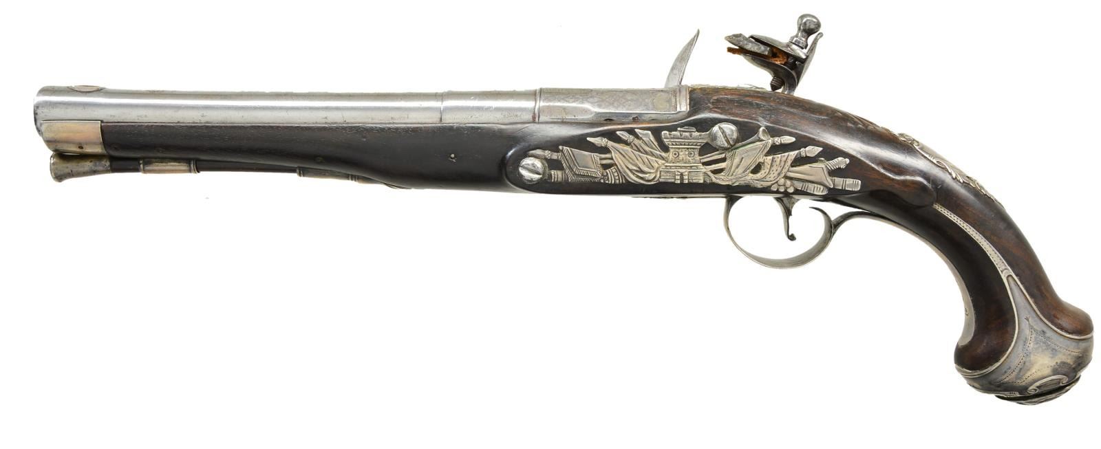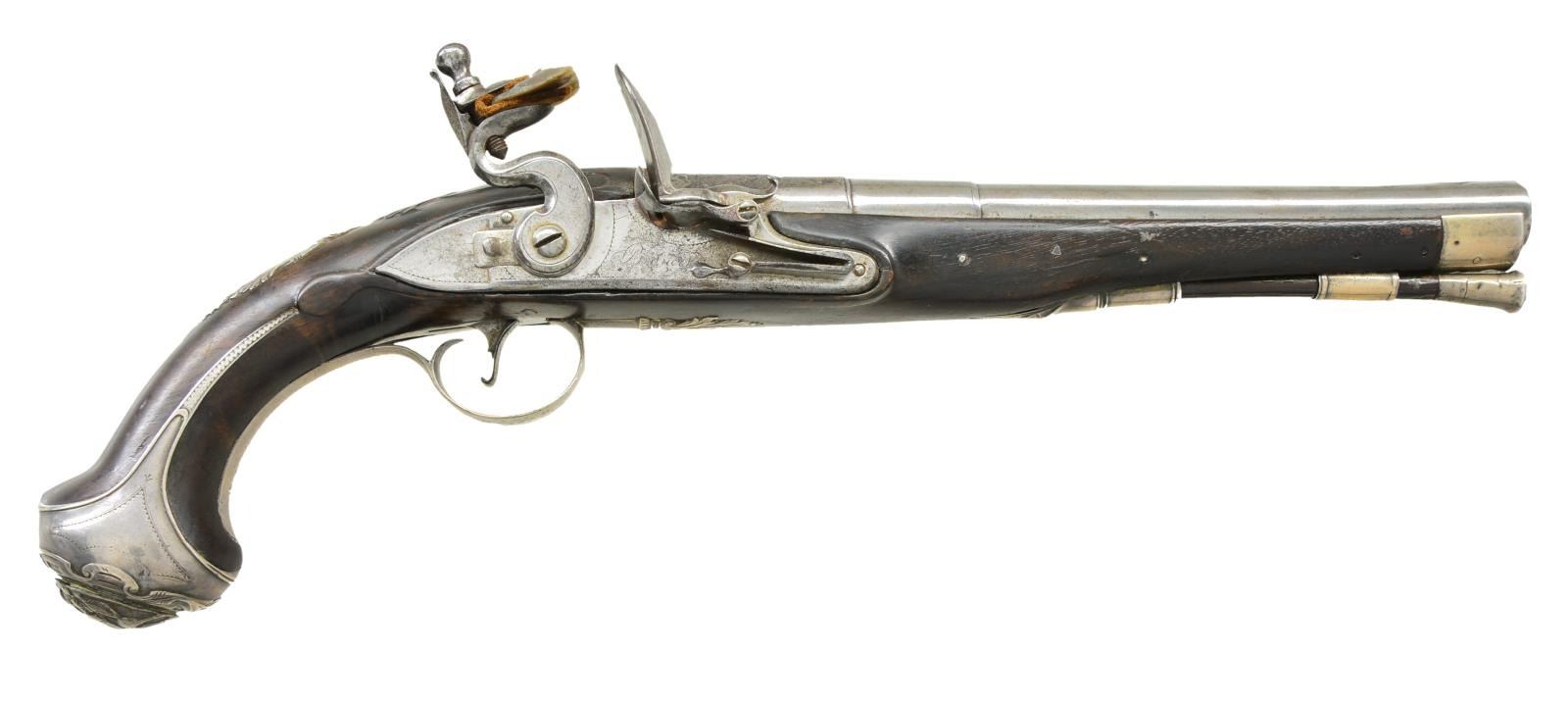 PISTOL. Cal. 50. NSN. Bbl. 9" round w/ faceted transitions to octagon & fluted breech section. Flats are marked “BRANDER” & “LONDON”. Breech section of bbl. & top tang have silver wire inlaid engraving. Low blade sight on German Silver base. Brander marked lock has borderline engraving. Pin fastened stock having tear drop points w/ clam shell relief carving around top tang. Silver stock fittings include ornate butt cap, trigger guard w/ oak leaf finial, ornate pierced side plate, fancy wrist plate, faceted thimble, single faceted pipe & nose cap. Butt cap & side plate have patriotic themed designs. Trigger guard bow is engraved w/ a single Poppy flower. Tigger guard tang has series of 3 indiscernible markings followed by “P”. CONDITION: metal has cleaned bright appearance. Stock has dark finish showing moderate wear. Moderately worn bore. (01-23060/DS). ANTIQUE. $1,500-2,200.