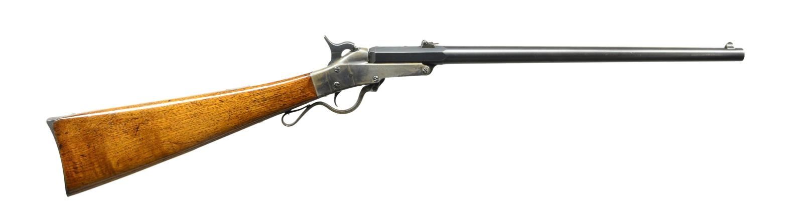 CARBINE. Cal. 50. S# 24947. Barrel 20" rnd. w/ oct. shank. Semi circular front sight with 2 folding leaf rear sight. Case colored breechloading underlever operated action with center mounted hammer. Left side has saddle ring and bar. Right side of action has Mass Arms Markings. Left side has Edward Maynard patent markings. Lower tang has "1865" date. Left side of barrel has "S" inspection mark. Walnut stock with steel carbine buttplate. Left side of stock has 2 visible cartouches. Toeline of stock is stamped "GREEN GABLES". CONDITION: very fine. Barrel retains over 80% lightly faded blue. Action shows 40% light & fading case colors. Stock has added varnish over scratches, dents & marks. Rear lower tang screw is missing. Bright bore retains strong rifling. (01-22984/DS). ANTIQUE. $2,500-3,500.