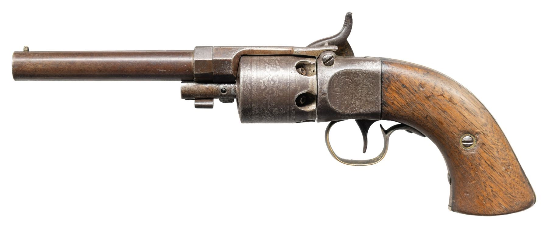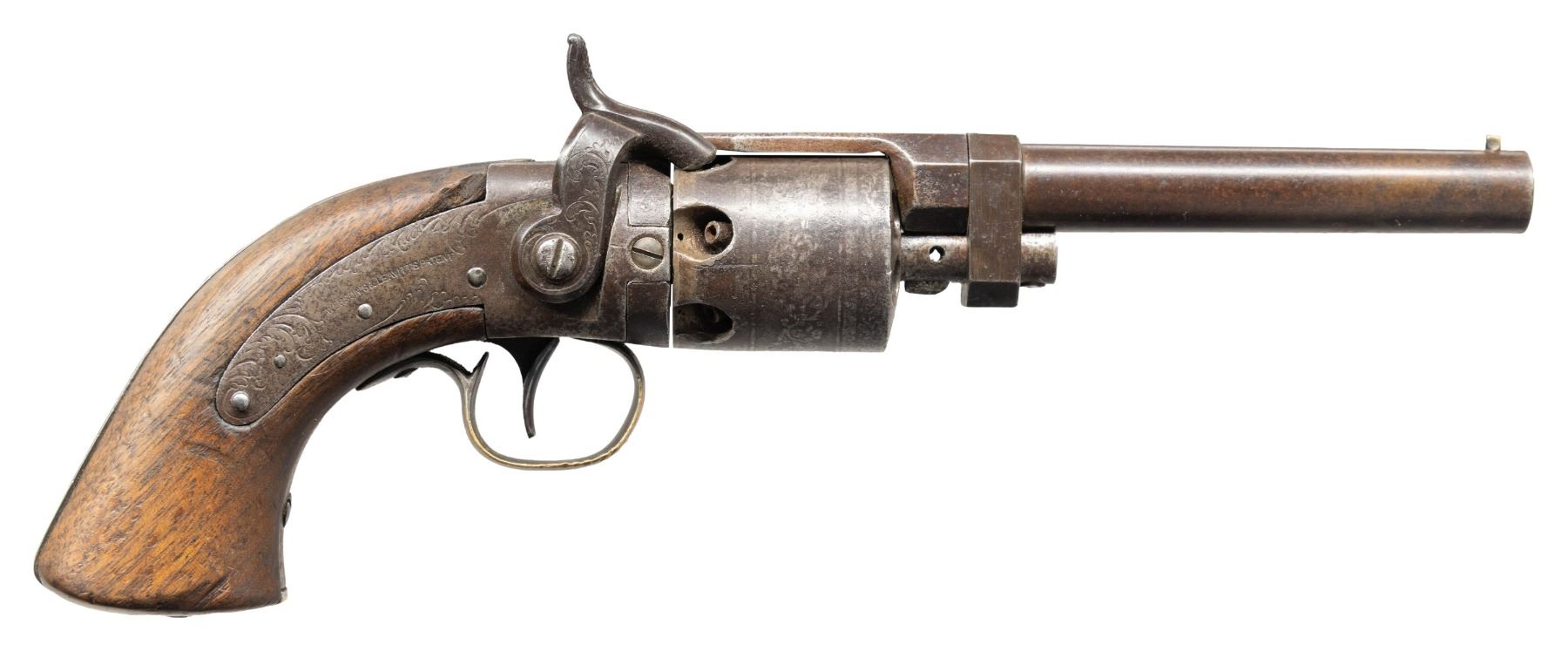 Cal. 31. NSN. Standard configuration pre-Civil War revolver. 10" overall, 4.25" barrel. Hinged barrel latch & barrel assembly. Silver plated brass triggerguard & backstrap. Top strap "MASS ARMS CO. / CHICOPEE FALLS" & lock "WESSON & LEAVITT", no external S#s. This is revolver that was discontinued due to Colt law suit over patent cog cylinder. CONDITION: good, original and complete, pitted overall, markings weak. grips have hand worn patina. Mechanically functional, good rifled bore. (01-28520/JS). ANTIQUE. $300-500.