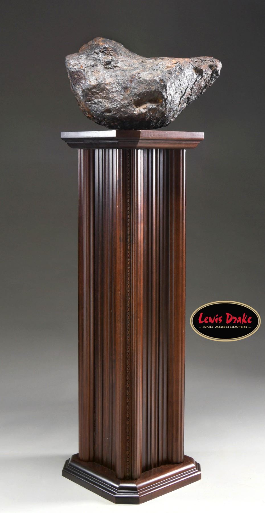 METEORITE WITH CUSTOM DISPLAY STAND. 17" x 11" x 9", 155 pound iron meteorite from Campo del Cielo, Argentina. Great overall aesthetic that can be displayed in several orientations, as "space sculpture". Several similar sized iron meteorites have sold for multiples of the high estimate here, and all three specimens are being sold unreserved with estimates just as guidelines. Accompanying 38" decorative wood pedestal for display. CONDITION: surface is very good showing good "fusion crust" where meteorite burned & melted with friction from atmosphere before it impacted. There is some iron oxidation from being on earth for 5000 years. Many collectors remove rust with wire brush if wanted to give a more homogeneous dark surface. PROVENANCE: from the renowned collection of quality sporting arms from Lewis Drake together with inventory of Lewis Drake Associates. (02-23537-1/JS). NON-GUN. $10,000-50,000.