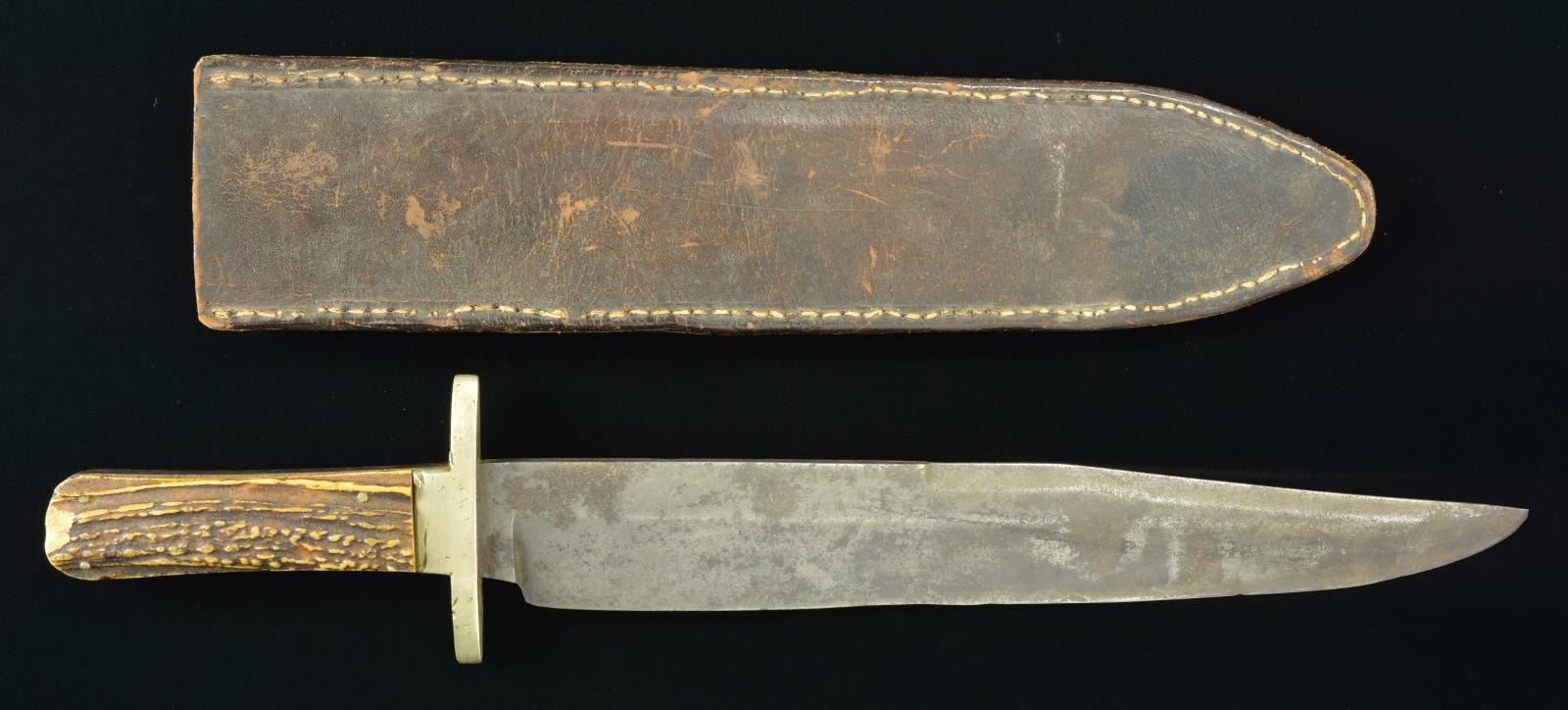 18” overall, 13” clip point blade, “G. WOSTENHOLM & SON / WASHINGTON WORKS / NONE ARE GENUINE BUT THOSE / MARKED I*XL”, on blade length: “THE REAL I*XL KNIFE” & “THE HUNTERS COMPANION”. Heavy reinforced solid German silver cross guard, stag grip slabs. Picture and described on page 365 of Norm Flayderman’s “THE BOWIE KNIFE”. Leather scabbard with riveted belt loop is later addition. CONDITION: good overall, well used, stained and pitted, model is only partially discerned due to pitting. Accompanying leather scabbard is good. PROVENANCE: From the Lifelong Collection of Glen E. Mattox. (02-18522/JS). $2,000-3,000.