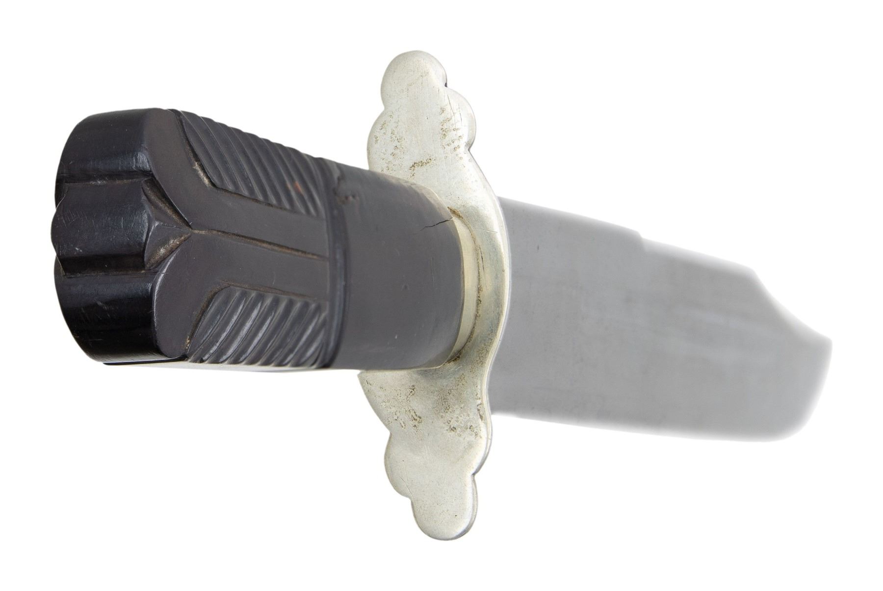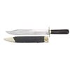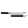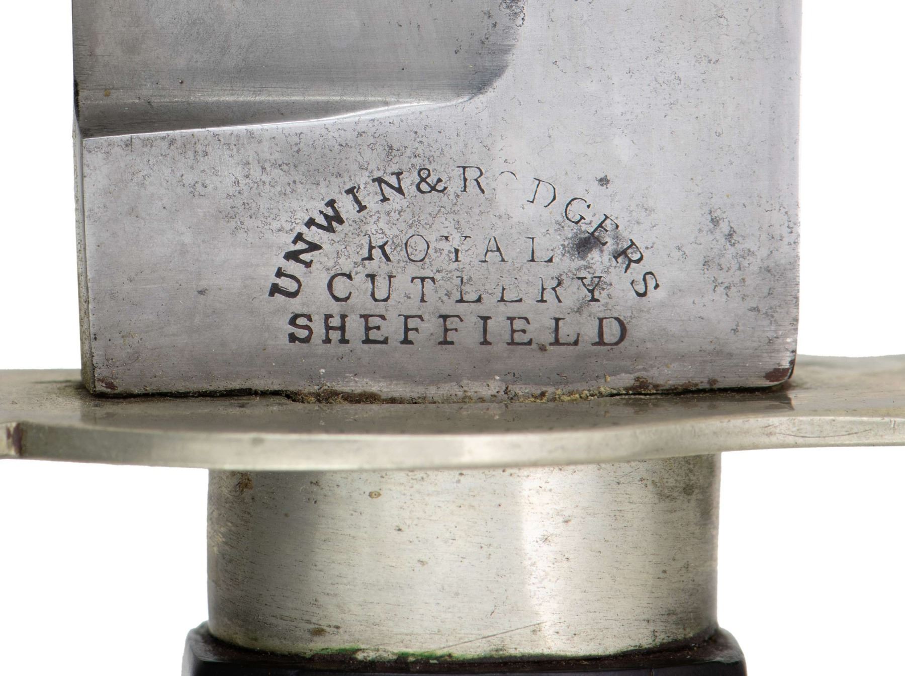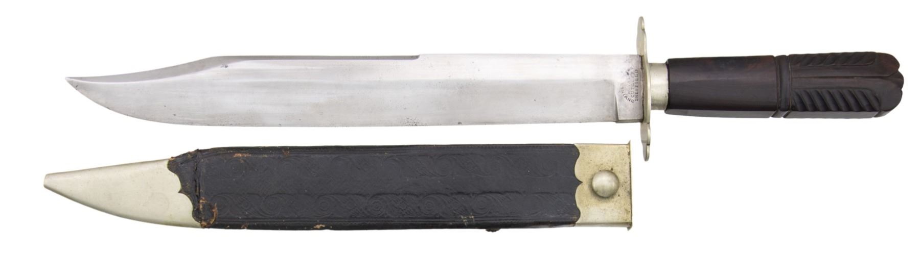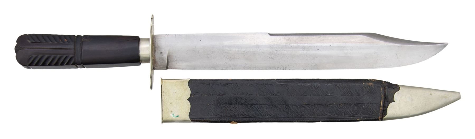 KNIFE. 17.75" overall, 12.25" clip point blade, .3" thick, "UNWIN & ROGERS / ROYAL / CUTLERS / SHEFFIELD" stamped on ricasso, carved & sculpted rosewood grip, German silver 3" cross guard & ferrule, decorated composite sheath with German silver mounts. Unwin & Rogers are best known for folders and pistol/knife combinations and this is maybe their largest and finest classic bowie extant. CONDITION: fine overall, blade has been professionally cleaned and polished, good maker marking, sheath has weakened folded repaired area above tip, but fits solid & tightly. PROVENANCE: Norm Flayderman family collection. (02-24503/JS). NON-GUN. $5,000-7,000.