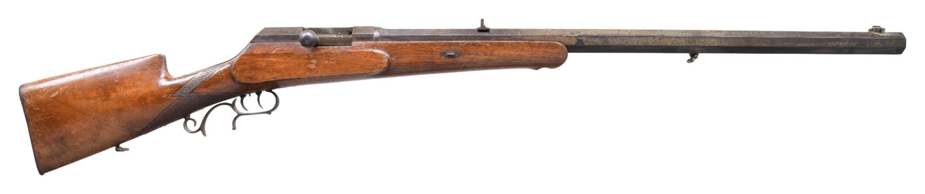 Cal. 16 Ga 2 1/2". S#10. Bbl. 32 3/4". Bead front sight. U-notch rear sight. German Vogelschiessen rifle made for eagle shooting competitions in which a wooden bird would be shot on top of a pole. Bottom of barrel has Suhl "826" German Nitro proofs indicatin Aug. 1926 mfg. for "913" bullet. Rifle appears unmarked & built on an upscale 1871 Mauser action. Double set triggers with finger curl trigger guard. Checkered walnut stock set with left side cheekpiece & bottom mounted sling swivels. UNATTACHED ACCESSORIES: a sheet of paper describing the rifle & German eagle shooting competitions. CONDITION: stock has added varnish with some chipping around butt, scattered flaking varnish, dings & handling marks. Metal is a dull gray patina with a couple areas of moderate tool marks on bbl. & moderate oxidation throughout. Action functions properly when hand cycled. Good bright bore with strong rifling but a few notable patches of pitting & oxidation. (24-6955/MJC). CURIO. $1000-1500.