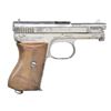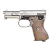 Cal. 6.35mm (25 ACP). S# 414566. Bbl. 3". Gun has crown over U proofs. Missing left sideplate, slide release & trigger assembly. Checkered walnut grips. MAGS: 1 nickel finished 9 rd. w/ bent base plate & scattered oxidation. CONDTION: left side of grip shows a couple 1 1/2" cracks, a couple chips. Grips show overall wear & handling marks. Metal retains 50% renickeled finish w/ a few spots of pitting, scattered flaking, scratches & oxidation. Fair bore w/ scattered pitting. (22-3204/MJC). CURIO. $100-200.