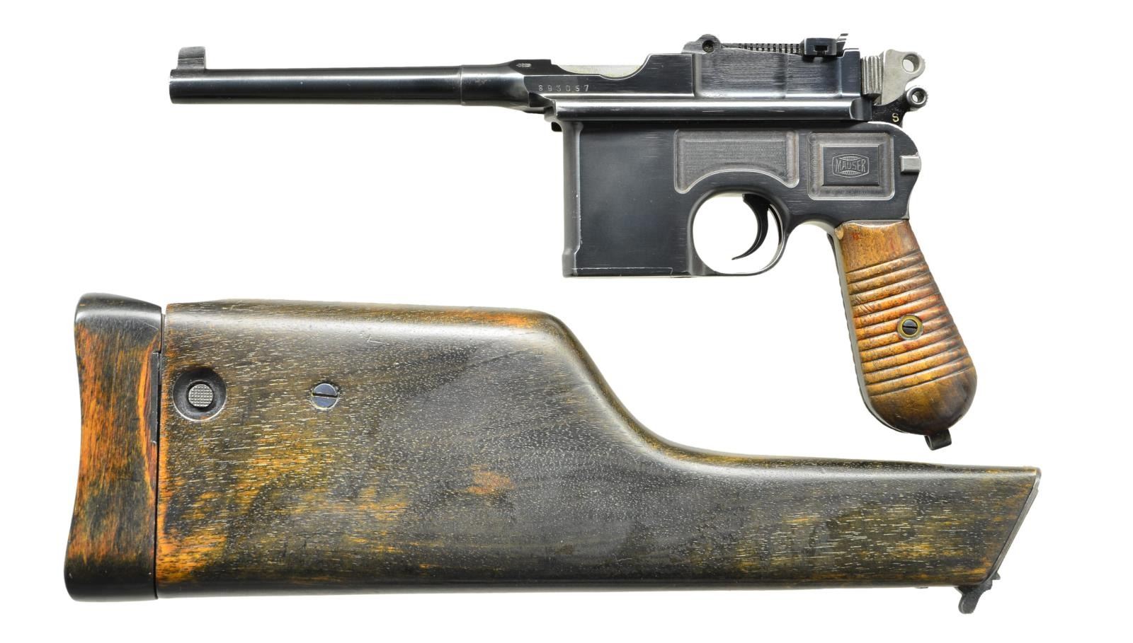 Cal. 7.63mm (30 Mauser). S# 893057. Bbl. 5 1/2" w/ inverted V sight; 50-1000 tangent rear. Late model w/ solid receiver rails & salt blued parts; S# 890000 to 921000 ending in late 1930s. Matching numbers on floorplate only; no other numbered parts except main # on receiver. 12 groove grips not numbered. Crown U proofs plus Mauser legend on right side of frame and over chamber. UNATTACHED ACCESSORIES: very good dark (almost black) unmarked stock w/ iron 680. Wood appears refinished yet metal appears original finish. CONDITION: very good as refinished w/ a few slight spots of peppery oxidation and light scratches on floorplate & magwell. All parts salt blued except Nitre blued bolt stop. Good grips w/ light marks & sm. chip at top front of left. Missing lanyard ring. Very good to excellent bore w/ faint wear. (22-3093/NW). CURIO. $1,200-1,800.