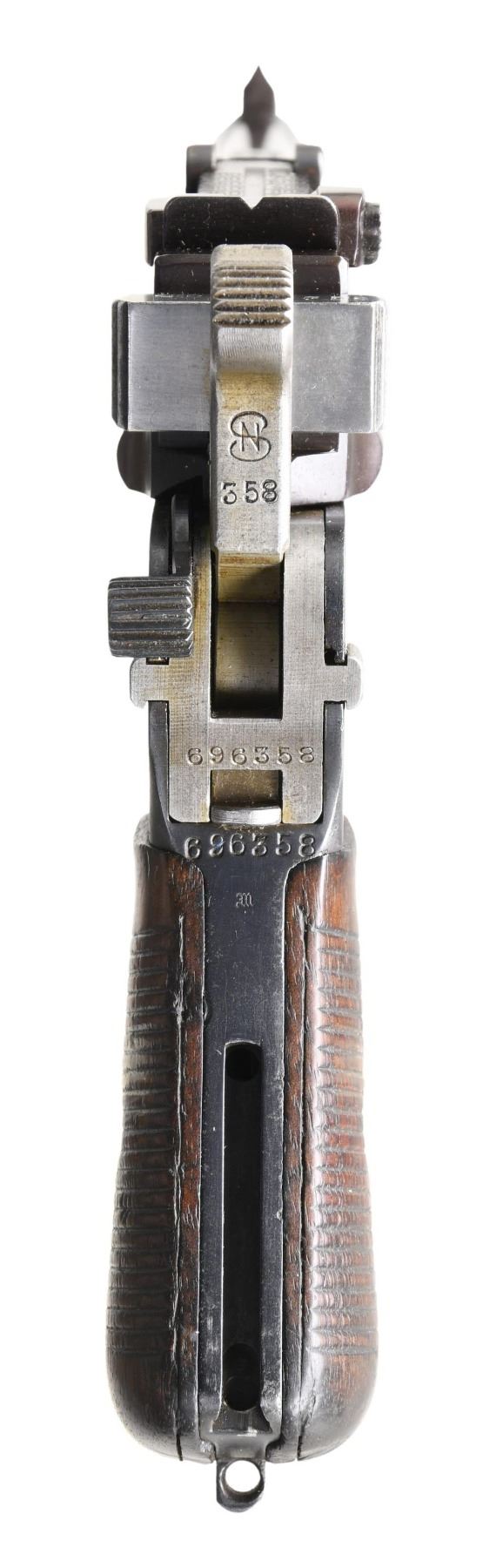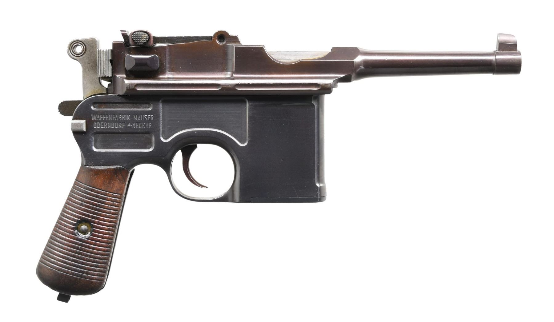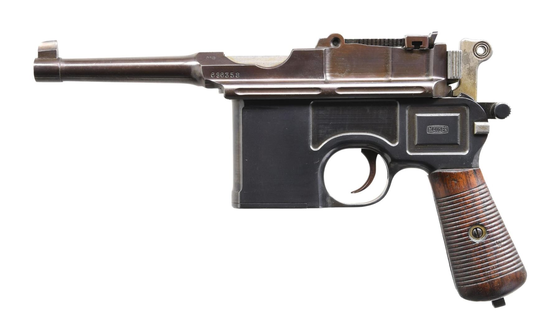 PISTOL. Cal. 7.63mm. S# 696358. Bbl. 3 7/8". Post-War C96 Bolo semi-automatic pistol, mfg. by Mauser. Top flat of the faceted breech is marked with Mauser's 3-line mfg. information, with a double-crowned "U" commercial proof stamped on the left quarter flat and the S# marked on the left flat. Left side of the frame is marked with the Mauser banner logo, with "WAFFENFABRIK MAUSER/ OBERNDORF A. NECKAR" marked on the right. Metal components exhibit a reapplied blue finish overall, save for the hammer, which is in-the-white, as well as the bolt, also polished in-the-white. Frame is mounted with 2-piece grooved wood grips. Blade front sight with tangent rear sight, graduated 50-1000. All serialized parts are matching and include the frame, floorplate, lock frame, locking block, hammer, bbl./bbl. extension, bolt, as well as the grips. CONDITION: metal components retain bountiful amounts of their reapplied blue finish, exhibiting a few superficial handling marks, with scattered spots/areas of pitting present beneath the finish. Mirror bore, as refinished, exhibiting some light pitting while retaining well-defined rifling throughout. Grips show some scattered marks and minor impressions from handling and storage, but otherwise remain sturdy and serviceable. (24-4089/MLW). CURIO. $800-1,200.
