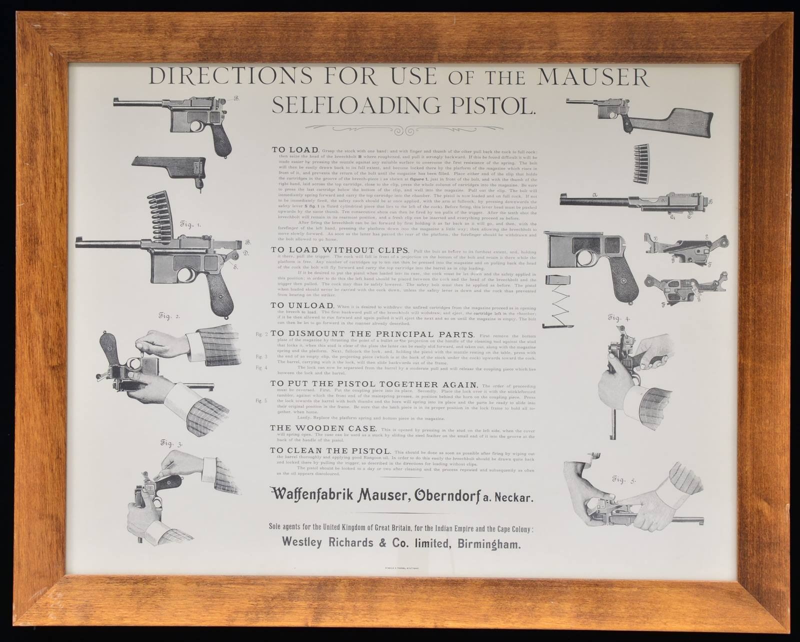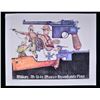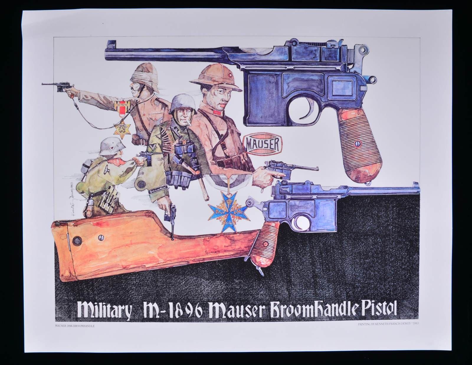 This lot consists of one framed & five unframed C96 Broomhandle related posters. The framed poster features a Westley Richards ad for the C96 Broomhandle. It gives an instructions on how to load, unload, clean, disassemble & assemble the pistol The poster is in very good condition w/ light wear on the wooden frame. The first two unframed posters are identical C96 Broomhandle prints by Kenneth Francis Dewey. They feature a Waffen SS soldier, two Chinese soldiers, a British solder, the Mauser logo, a Blue Max medal & of course the pistol itself. These posters rate about ver good w/ a couple creases on the edges. The other three unframed posters are identical w/ a Broomhandle in the center & several types of ammunition listed by maker. One of these posters is laminated the other two are not. They show some creasing on the edges. (02-16953-5/MJC). $100-200.