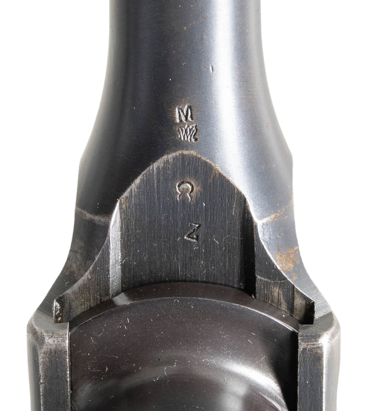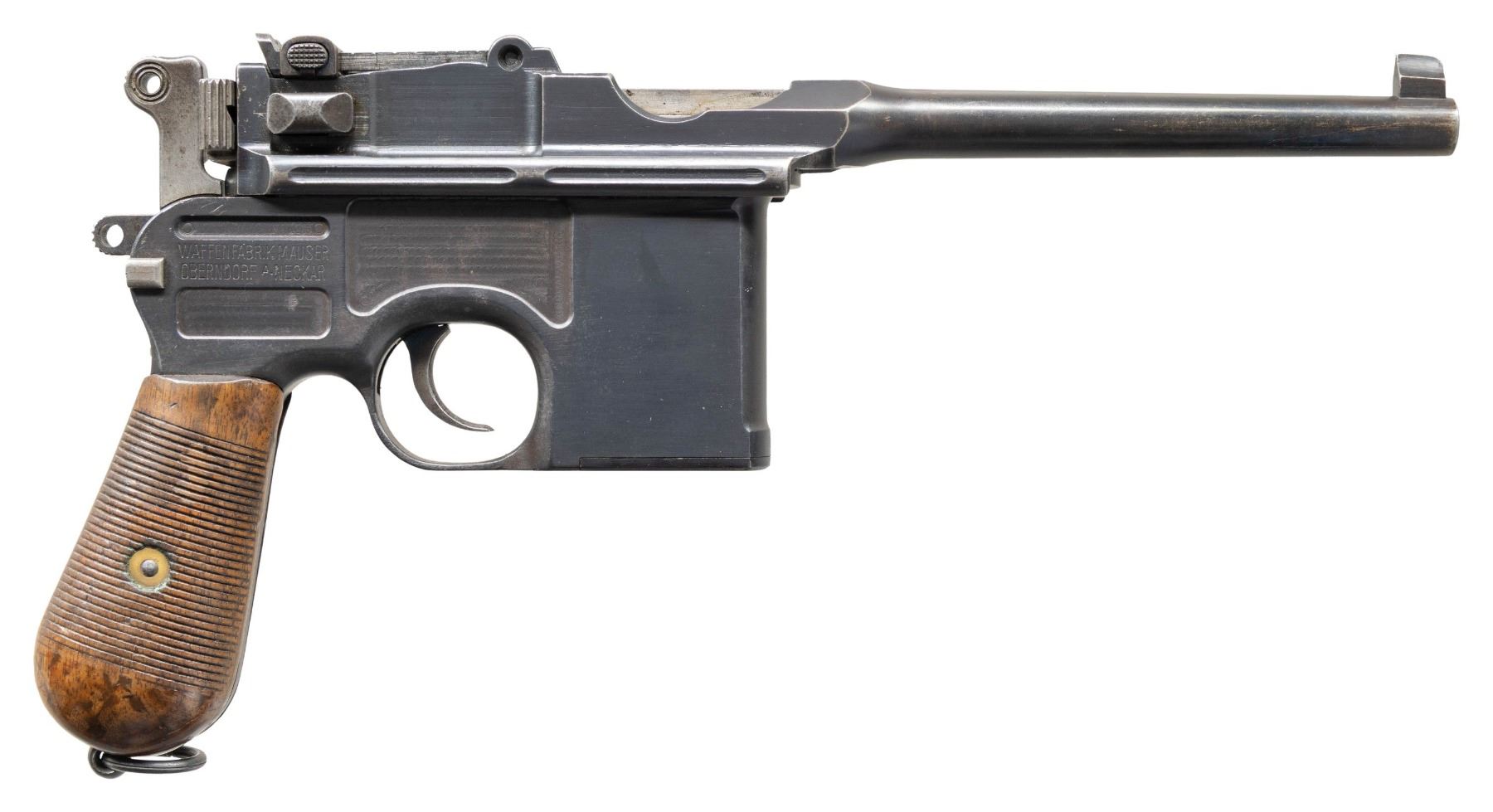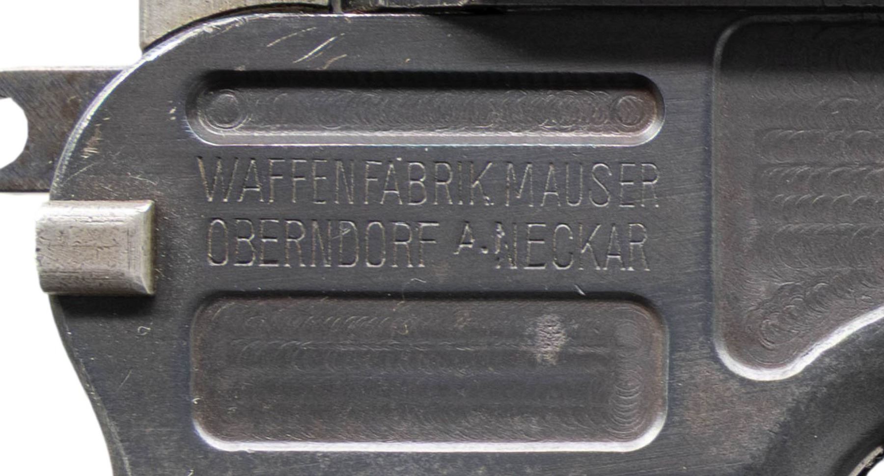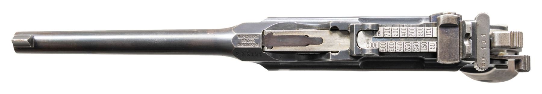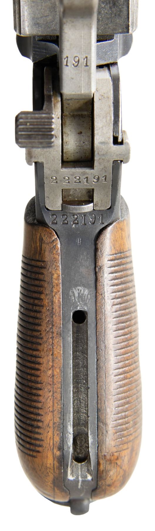 Cal. 7.63mm. S# 222191. Bbl. 5 1/2". C96 semi-automatic pistol mfg. by Mauser. Top flat of the faceted breech is marked with Mauser's 3-line address, with the S# marked on the left quarter flat, and a double crowned "U" commercial proof marked on the left. Frame and bbl./bbl. extension exhibit a nicely reapplied blue finish, with some small parts including the trigger, bolt stop housing, and rear sight slide exhibiting a nitre blue finish. Bolt and locking block are polished in-the-white. Sub-frame exhibits a proper dull gray appearance. Frame is mounted with 2-piece grooved wood grips and features a lanyard ring on the butt. Fixed blade front sight and tangent V-notch rear sight graduated 50-1,000. All serialized parts are matching and include the frame, floorplate, sub-frame, hammer, sear, bbl./bbl. extension, bolt, bolt stop, as well as the grips. CONDITION: metal components retain the majority of their reapplied blue finish, showing light to mild edge wear, some superficial handling marks, and scattered spots of light surface oxidation overall. Bbl. exhibits an area/streak of wear that is fading to gray patina on the lower left side. Nitre blue parts retain good amounts of their original finish, showing areas of wear that are fading to gray patina. Bore exhibits consistent light pitting, while retaining strong rifling throughout. Proper manual mechanics. Grips show some scattered marks and minor impressions from handling and storage, but otherwise remain sound. (25-4659/MLW). CURIO. $1,000-1,500.