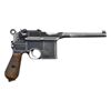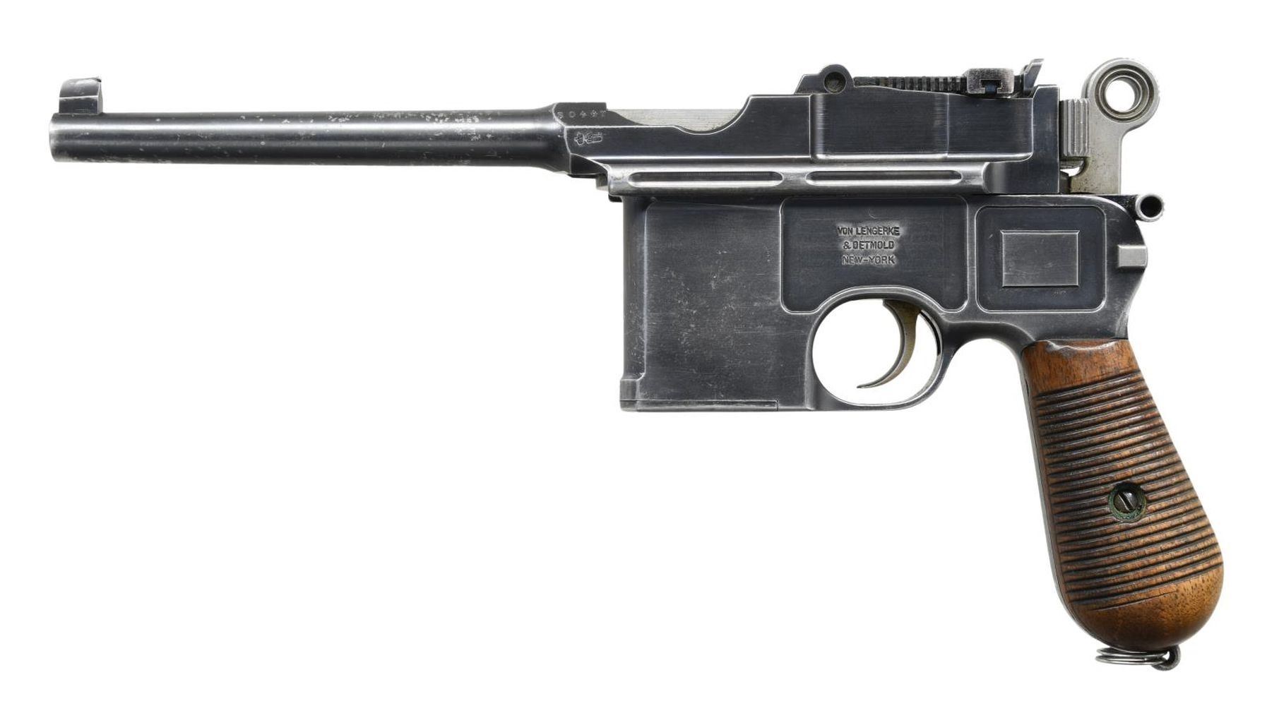 VL&D MARKED SEMI-AUTOMATIC PISTOL. Cal. 7.63mm. S# 30447. Standard, early production Large Ring Shallow Milled C96 with 5.5” barrel having a fixed, beaded front sight and slip-in 50-1,000 rear sight. Long extractor and a single-lug firing pin. The usual address is on top of the chamber, with the serial number on the left chamber flat. Crown/U mark on the left side of the barrel extension; antler proof on the right side. Left side of the frame is marked "VON LENGERKE/ & DETMOLD/ NEW-YORK". There is no Mauser address on the right frame. Small parts are fire-blued, except for the strawed trigger. Extensive disassembly shows all matching serial numbers, including the rear sight assembly, bolt stop, bolt, firing pin, hammer, subframe, locking lever, frame, follower, floorplate, small subframe components, and locking block. Even the wood-serrated grips are correctly stamped with the full serial number (along with a penciled "NIX") on each panel. A reproduction lanyard ring is present. CONDITION: very good original rust blue, approximately 75-80% coverage, with spotting and fading in the usual locations, as one might expect from a pistol that has seen moderate use. Comparable-condition fire-blued parts show no suggestion of enhancement. Grips are dark with oil staining and a few light scattered handling marks. Sprung lanyard ring. Bright bore with sharp rifling. Correct manual mechanics. This is an excellent opportunity to own a highly attractive early configuration and all matching Large Ring C96. PROVENANCE: the collection of Curtis H. Halvorson. (23-5820/LMA). CURIO. $2,500-3,500.