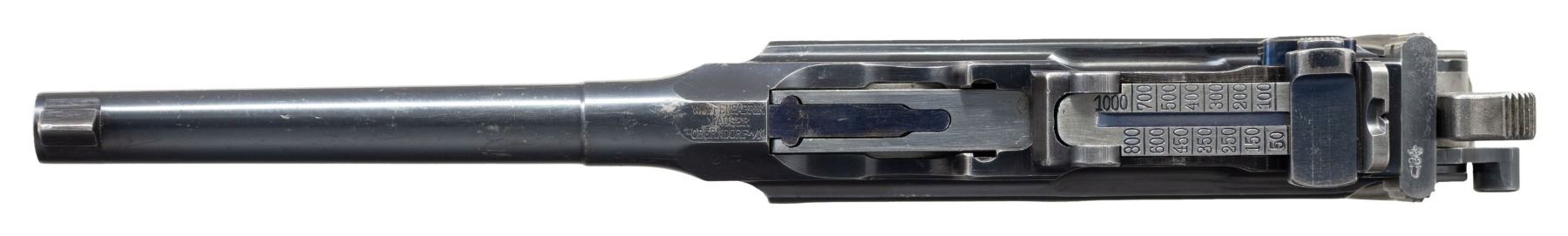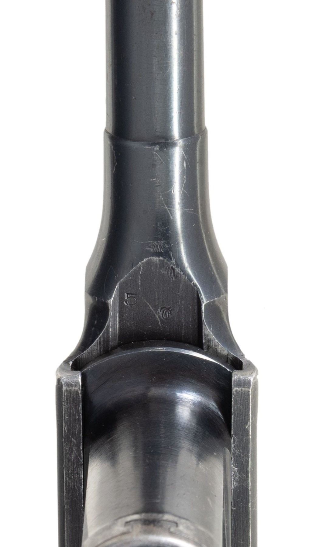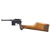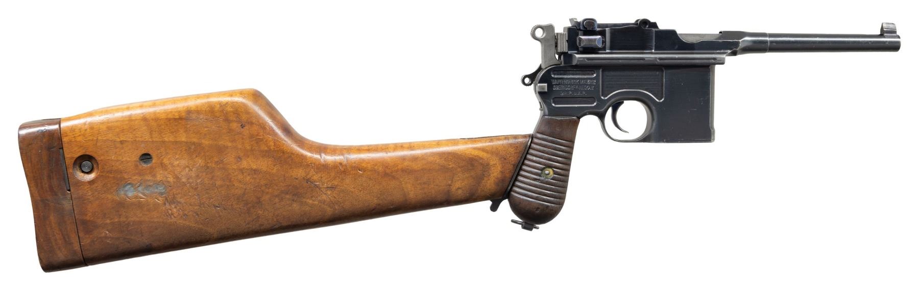 PISTOL WITH STOCK/HOLSTER. Cal. 7.63mm. S# 854329. Bbl. 5 1/4". C96 Model 1930 Commercial semi-automatic pistol mfg. by Mauser. Top flat of the faceted breech is marked , with Mauser's 3-line address, with a double crowned "U" commercial proof (repeating on top of bolt) marked on the left quarter flat, and the S# marked on the left flat. "Island" on left side of the frame is marked with the Mauser banner logo, with "WAFFENFABRIK MAUSER/ OBERNDORF A. NECKAR/ D.R.P.u.A.P." marked on the right. Frame and bbl./bbl. extension exhibit a high polish salt blue finish overall, with some small parts including the trigger, rear sight slide, extractor, and grip screw exhibiting a nitre blue finish. Top and rear flats of the bolt are polished in-the-white. Frame is mounted with 2-piece grooved wood grips. Standard integral blade front sight and tangent V-notch rear sight graduated 50-1000. All serialized parts are matching and include the frame, floorplate, and bbl./bbl. extension. UNATTACHED ACCESSORIES: correct wood should stock marked with the Mauser banner logo on one side. CONDITION: metal components retain the majority of their original salt blue finish, showing some scattered spots of wear and thinning fading to gray patina (primarily on edges and on the bbl.), as well as scattered scratches and superficial handling marks overall. Nitre blue parts retain large amounts of their original finish with wear fading to gray patina in contact areas. Bore is relatively bright, exhibiting consistent mild oxidation/pitting, while retaining strong rifling throughout. Proper manual mechanics. Grips show some scattered superficial marks and impressions from handling and storage, but otherwise remain sound. Stock/holster shows scattered marks and impressions, with a series of impressions present on the obverse side of the Mauser banner logo. (25-5453/MLW). CURIO. $1,500-2,250.
