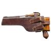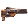 PISTOL WITH STOCK & HARNESS. Cal. 7.63mm. S# 917017. Bbl. 5 1/2". C96 Model 1930 Commercial semi-automatic pistol mfg. by Mauser. Top flat of the faceted breech is marked with Mauser's 3-line address, with a double crowned "U" proof (repeated on top of bolt) marked on the left quarter flat. Left side of the frame is marked with the Mauser banner logo on the "island", with "WAFFENFABRIK MAUSER/ OBERNDORF A. NECKAR/ D.R.P.u.A.P." marked on the right. Metal components exhibit a salt blue finish with the bolt being polished in-the-white. Frame is mounted with 2-piece grooved wood grips, and features a lanyard ring on the butt. Standard C96 pattern fixed blade front sight and tangent V-notch rear sight graduated 50-1000. All serialized parts are matching and include the frame, sub-frame, floorplate, as well as the bbl./bbl. extension (top flat, rear of tangent sight). UNATTACHED ACCESSORIES: non-matching unmarked C96 wood stock/holster with WWI mfg. harness marked "OSKAR SCHEYHING/ CASSEL/ 1916" on the rear. Stock/holster has been sanded and refinished at one time, and features an apparent period added brown leather belt loop, retained via 6 pins/nails on the lower section. CONDITION: metal components retain the majority of their original factory salt blue finish, exhibiting some areas of wear and thinning fading to gray patina (primarily on edges), scattered superficial handling marks, as well as small some small scattered spots of light to mild pitting. Rear grip strap has been cleaned at one time. Bore is bright, exhibiting scattered spots of light to mild pitting and areas of mild to moderate pitting at the muzzle, while retaining well defined rifling throughout. Proper manual mechanics. Grips show scattered superficial marks and small impressions from handling and storage, with a large impression present on the left panel towards the bottom right edge. Stock shows scattered superficial handling marks, but otherwise remains sound, with metal hardware having faded to a gray patina. Leather harness remains malleable, exhibiting general overall wear, with some areas of age related cracking and crazing. Harness exhibits a small hole at the toe of the putzstock provision. (25-6566/MLW). CURIO. $1,500-2,250.