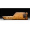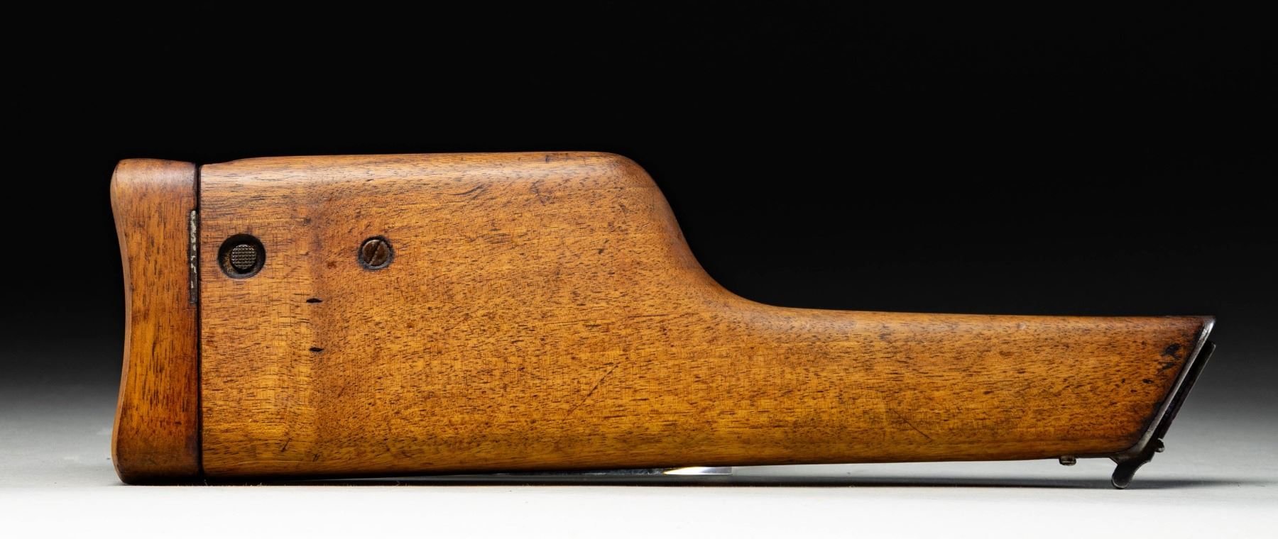 Stock / holster mfg. for use with Mauser's C96 pistol. Stock is virtually unmarked, save for the S# "3728" on the steel lug. Wood has been sanded and refinished, with metal fittings having been nickel plated at one time. Stock lug screw is an improper replacement. This example appears to be for a fixed sight C96 variation, with a standard tangent sight variation not fitting past the rear sight pin "ears". CONDITION: stock shows scattered marks and impressions from handling and storage, with patches of finish loss and/or discoloration present on one side. Body exhibits an approx. 3 1/4" crack at one corner. Lid exhibits a spliced repair along the upper rear edge, with a small added hole present on the interior. Metal fittings have primarily flaked and faded to a gray patina, exhibiting spots and patches of light to mild surface oxidation and pitting. (02-19960/MLW). NON-GUN. $200-400.
