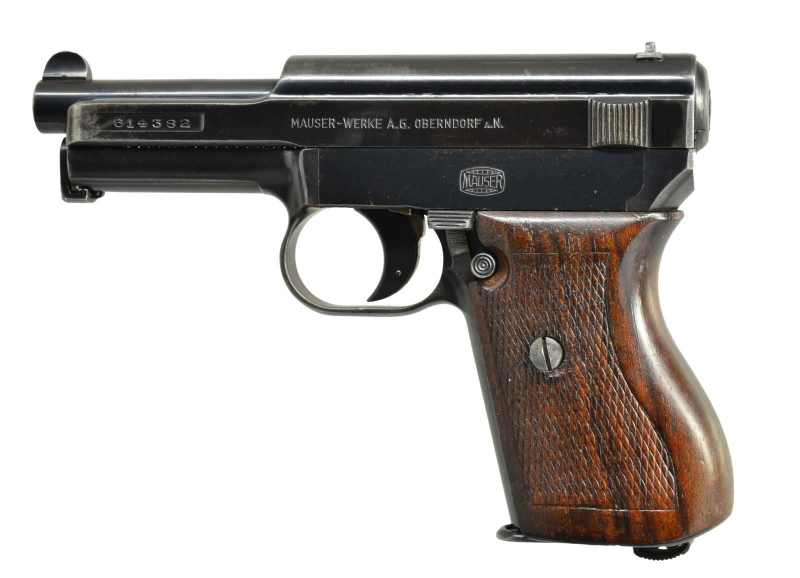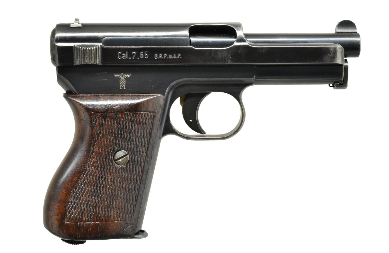 Cal. 7.65mm (32 ACP). S# 614382. Bbl. 3.4" w/ matching number & eagle N proof (also at top rear of slide). Mfg. 1934-1939 being similar to Model 1914 w/ improved grip shape. Eagle party symbol over M on right side of frame above mid point of grip. Gloss blued finish w/ matching numbered frame, slide & sideplate. MAGS: 1 very good 8 rd. w/ Mauser banner floorplate additionally marked "N1607" over horizontal slim "X". CONDITION: very good plus appearance w/ slight high point wear from holstering. Hand worn grip w/ some very light handling marks. Bright, almost near excellent bore having slight bulge at mid point. (22-74/NW). CURIO. $700-1,000.