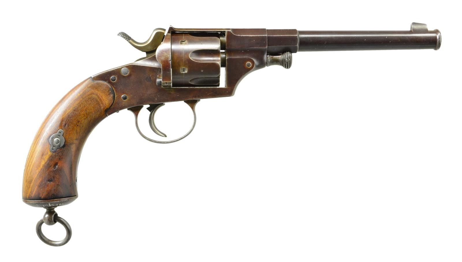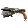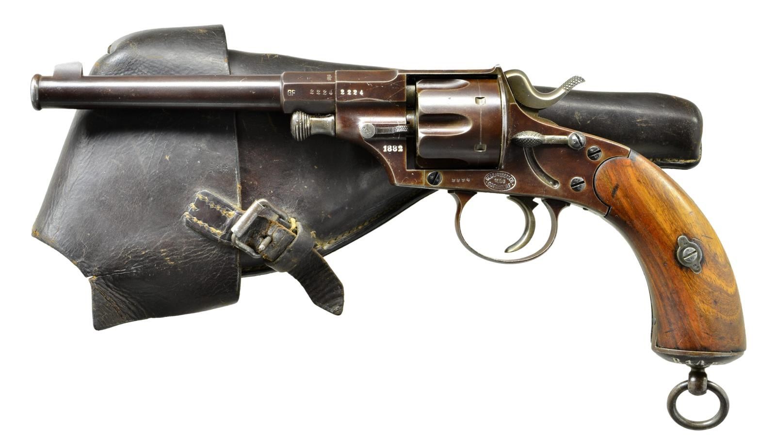 Cal. 10.55 x 25R. S# 2224. In use by Germany from 1882-1919. Lg. sturdy revolver w/ safety lever yet mfg. w/out extractor requiring removal of cyl. & use of pivot pin to individually remove spent cartridges. Bbl. 7.2" w/ integral inverted V sight blade behind flared muzzle; mostly rnd. (4 5/8") changing to octagon at frame (1"). Mfg. 1882 w/ matching numbered parts throughout, including loading gate and screw heads, except cyl. axle release lever number 10. Note that cyl. axle will not remove due to congealed grease. Sideplate marked Mauser in oval stamping. Left flat of bbl. marked "GF" as is rear of cyl; various sm. assembly proofs throughout. Butt cap regiment marked "B.J(reversed).M.I.6.125." in various fonts on right side; left previously marked & crossed out "B.1.A.P.2.68." Front edge of butt cap has crown "U" proof & rear edge has crown "S". Trigger & hammer are in the white. Smooth European walnut grips. Metal butt cap w/ robust lanyard ring whose loop is also matching numbered. UNATTACHED ACCESSORIES: good plus dark brown flap holster w/ buckle & strap retention. Dual angled belt loops on back. Lower front mid point of flap marked w/ "ANJ" all over 12 above 88. Underside of flap has 3 or 4 rectangular boxed ink markings. CONDITION: Very good to excellent original brown finish w/ high point wear & touched up frame screws. Thinning w/ early patina of backstrap. Good plus replacement grips numbered "952" w/ handling marks, appearance of oiled refinish; mixture of metal proud of grips plus grips proud of metal. Good bore w/ distinct rifling w/ areas of cleaned light to moderate pitting. Lightly pitted cyl. chambers. Near perfect manual mechanics including safety. A rare opportunity to buy a high condition Mauser marked 1879 Reichs Revolver w/ an original, intact holster. (01-20270/LA). ANTIQUE. $2,750-3,250.
