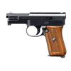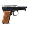 Cal. 6.35mm (25 ACP). S# 385845. Bbl. 3". Round blade front sight. V-notch rear sight. Fine condition Mauser 1910 retains a high degree of original blue finish. The right side of the frame is marked with a Mauser banner. Left side of the slide is marked "Cal. 6,35" and a crown "U". Checkered walnut grips. MAGS: 1-9 rd., marked with the Mauser banner on the baseplate. CONDITION: right side of grip shows a dent; grips otherwise show scattered dings and handling wear. Metal retains 85% of its original blue with a couple spots of oxidation, scattered fading, edge wear, and some light scratches. Very good bore with strong rifling. (24-1093/MJC). CURIO. $400-600.