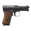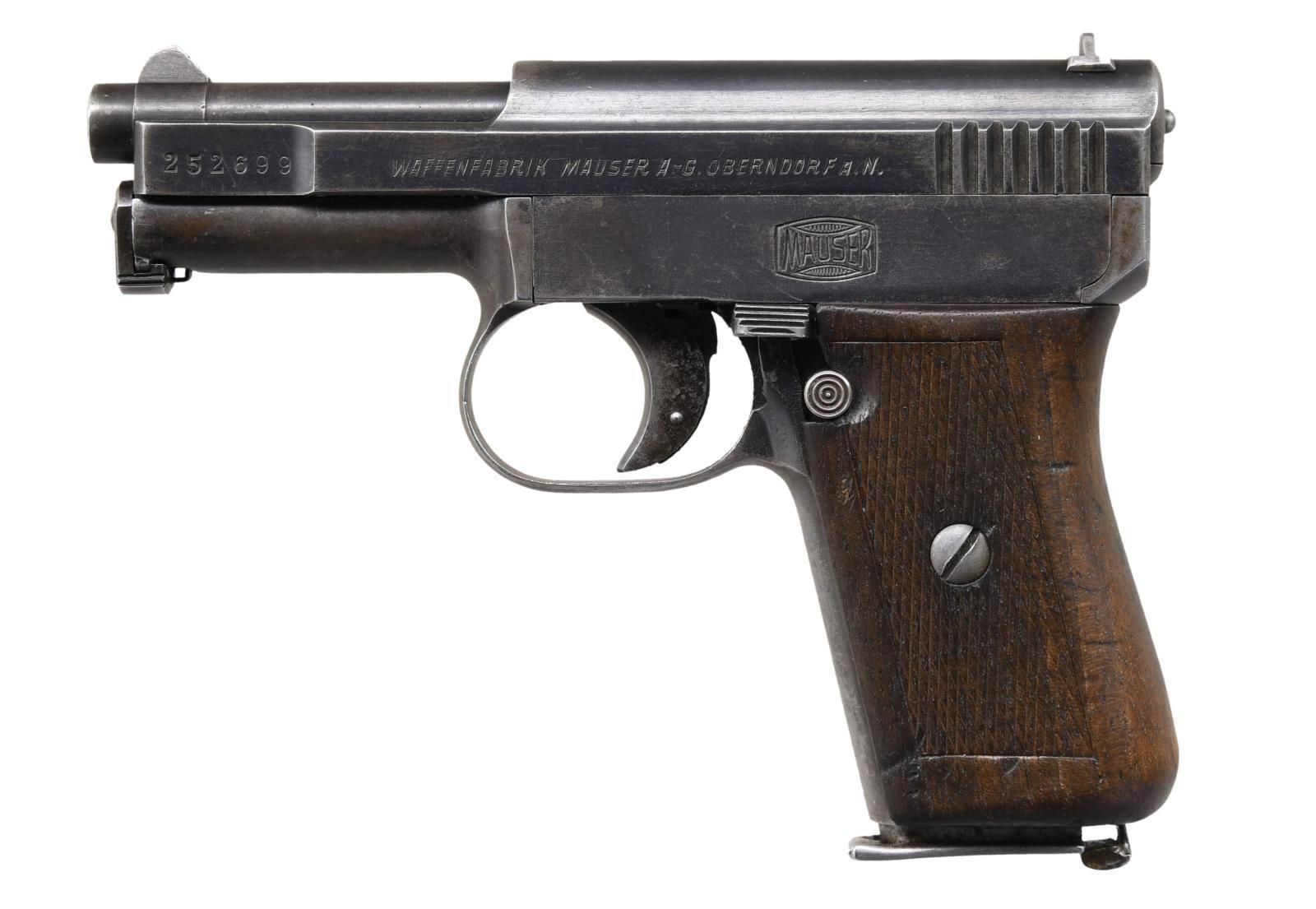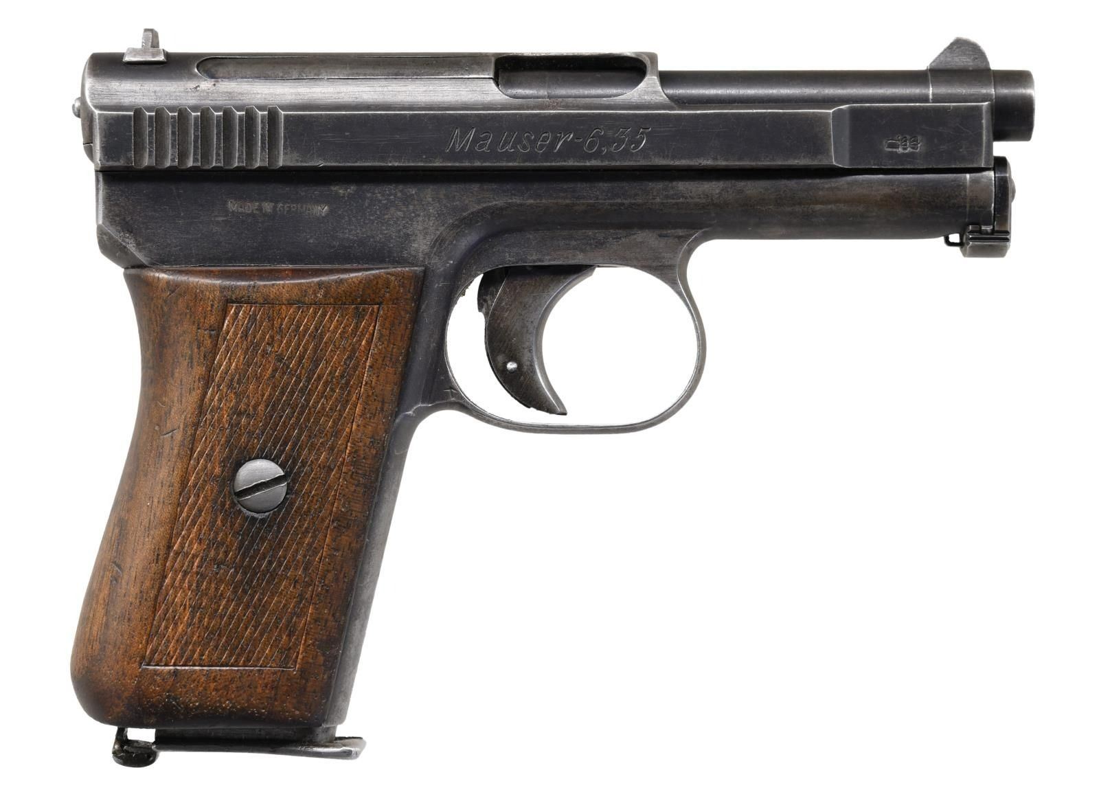 Cal. 6.35mm. S# 252699. Bbl. 3". Model 1910 semi-automatic pistol mfg. by Mauser. Left side of the slide is marked with the S#, followed by Mauser's mfg. information, with the cal. designation and a Crown/U proof marked on the right. Sideplate is marked with the Mauser banner logo. Right side of the frame is marked "MADE IN GERMANY". Metal components exhibit a blue finish. Frame is mounted with a 1-piece checkered wood wrap around the grip. Heel mag. release is a custom-made replacement. Matching numbers are present on the frame, sideplate, slide, and bbl. MAGS: 1 9-rd. CONDITION: metal components retain large amounts of their original factory blue finish, exhibiting areas of wear and thinning overall that show through to gray and brown patinas. Bore exhibits moderate pitting and retains good rifling throughout. Grip exhibits scattered marks from handling and storage but otherwise remains sturdy and serviceable. (24-1040/MLW). CURIO. $300-400.