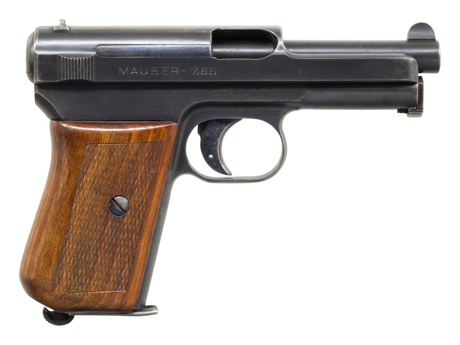 Cal. 7.65mm. S# 369397. Bbl. 3 7/16". Model 1914 semi-automatic pistol mfg. by Mauser. Left side of the slide is marked with the S#, followed by "WAFFENFABRIK MAUSER A.-G. OBERNDORF A.N./ MASUER'S PATENT", with "MAUSER - 7,65" marked on the right. Top of the slide and right side of the forward bbl. lug are marked with a double crowned "U" commercial proof. Metal components exhibit a blue finish overall, with the trigger, extractor, and grip screws exhibiting a nitre blue finish. Frame is mounted with a 1-piece flat checkered wood wrap around grip. Standard fixed half-moon blade front sight and dovetailed notched rear sight. All serialized parts are matching and include the frame, sideplate, slide, and bbl. MAGS: 1 8-rd. CONDITION: metal components retain the majority of their original factory blue finish, exhibiting some spots/patches of light to mild wear and thinning that are fading to gray patina, some spots of light pitting, as well as scattered spots of light surface oxidation. Nitre blue parts exhibit some wear, with scattered spots of light surface oxidation. Near mirror bore, exhibiting some spots of light pitting, while retaining well defined rifling throughout. Proper manual mechanics. Grip shows some superficial marks and minor impressions from handling and storage, but otherwise remains sound. (25-4653/MLW). CURIO. $350-550.