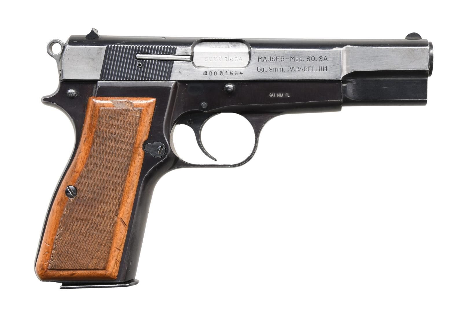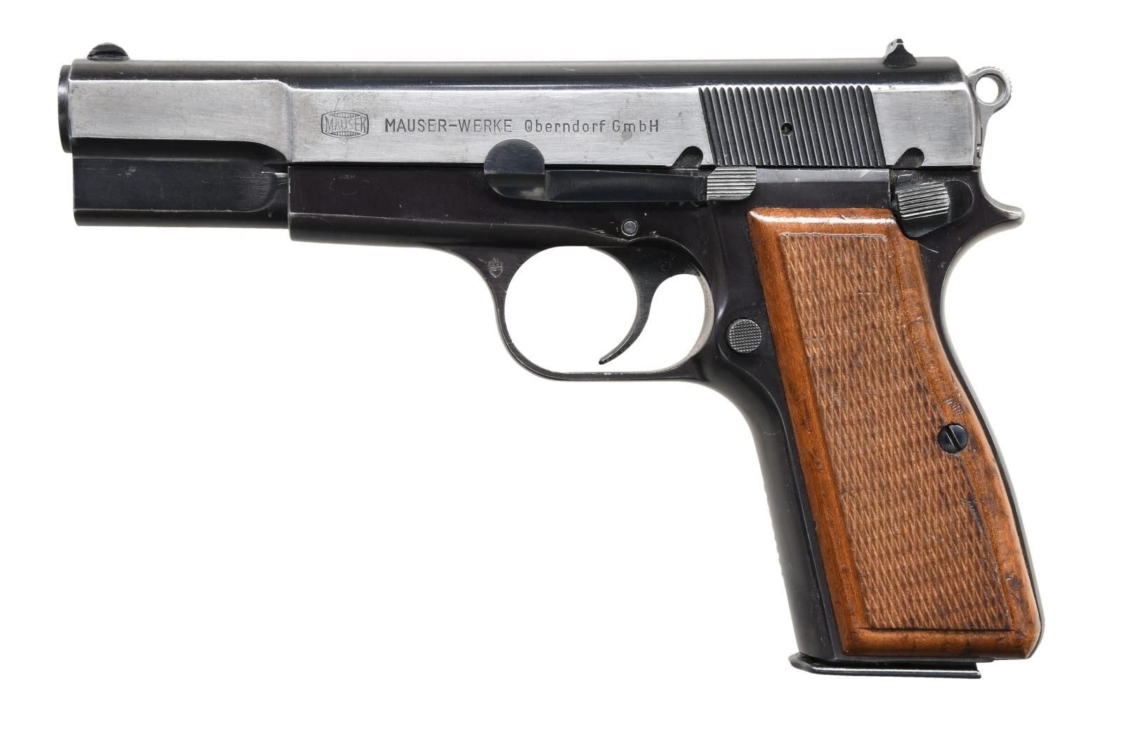 Cal. 9mm Luger. S# 80001664. Bbl. 4 5/8". Round blade front sight. Square-notch rear sight. All visible matching numbers. Right side of the frame has a small import marking. Mauser Oberndorf licensed, Hungarian-made Hi Power-style pistol. Blued finish. Checkered hardwood grips. MAGS: 1-13 rd. CONDITION: grips show some added varnish w/ scattered dings and handling marks. Slide retains 50% original blue w/ the sides being cleaned to bright with some light oxidation & scratches. Hammer also appears to be cleaned to bright. Frame retains 85% of its original blue w/ some scattered fading to gray, light scratches, & handling wear. Bright, near-excellent bore. (23-6944/MJC). MODERN. $600-900.