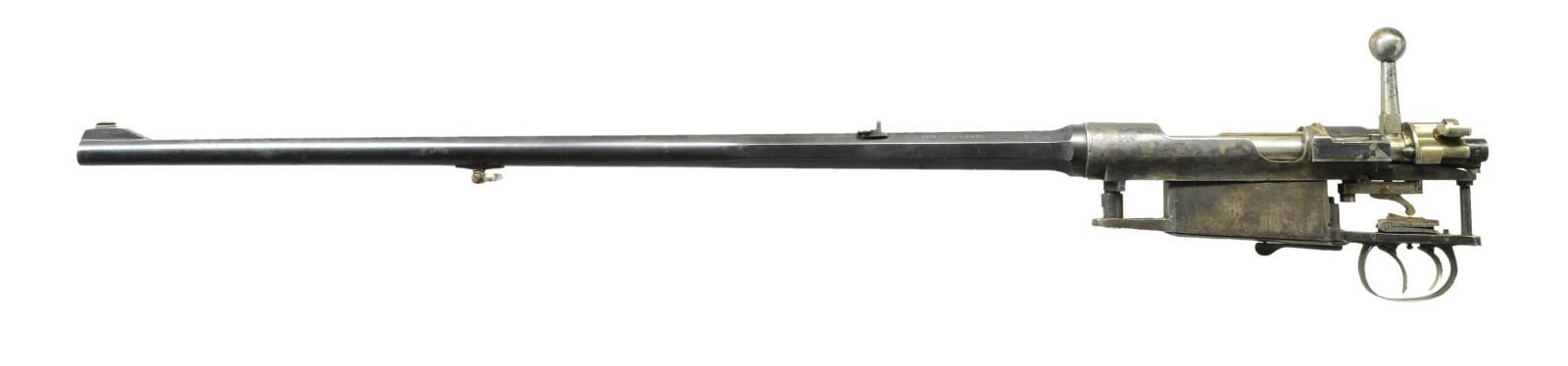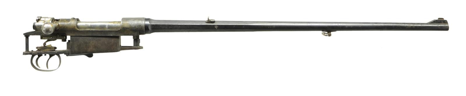 Cal. 9X57mm Mauser. S# 5618. Bbl. 23" blued octagon and round. Round at receiver flaring to octagon for 8", then round plus flat top with wave pattern for entire length. Ramped brass bead front sight and two leaf express rear plus 7/8" European swivel on barrel. Bottom of barrel has 942 (date), 567, Eagle N, Eagle J, heart symbol and "J. G. ANSCHUTZ". Receiver case colored with fine scroll engraving and punch dot backgrounds. Double set trigger guard assembly has same style engraving, blued finish and lever latch for floorplate; attachment screws sporting style without lock screws. Military style bolt and safety with straight handle (in the white except blued cocking piece). CONDITION: fair to good appearance with light and peppery oxidation throughout. Case colored receiver with far better appearance having minimal peppery oxidation spots; minimal fading. Fully functional with very good bore having light wear. With minimal restoration, good candidate for restoration of big bore rifle barreled by Anschutz. (22-3499/NW). MODERN. $200-400.